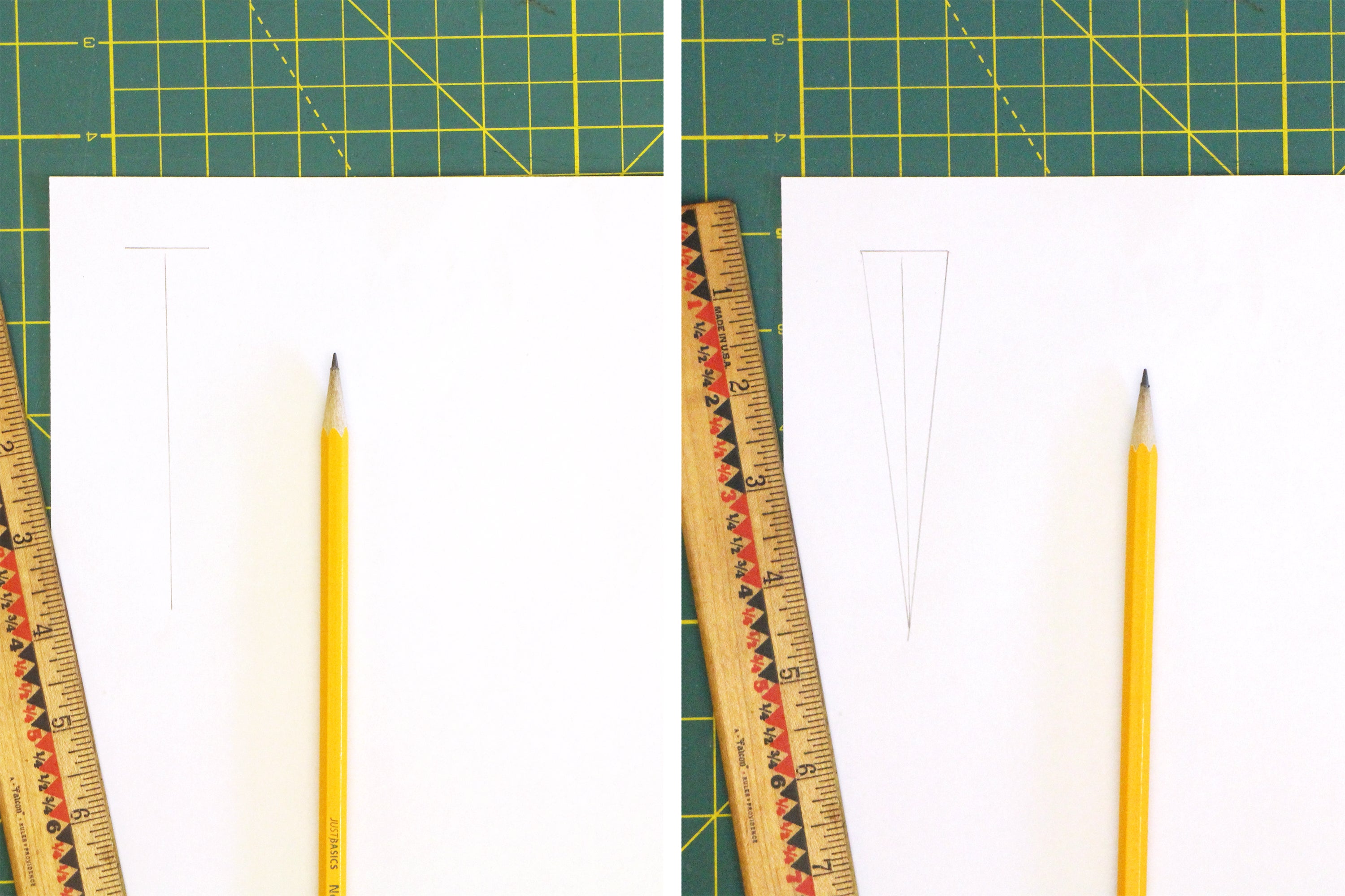 Using a pencil and a ruler draw the letter 'T' on the paper, with the leg of the letter about four times longer than the bar. Draw diagonal lines connecting the bar of the T to the leg terminal to create the elongated triangle shape.