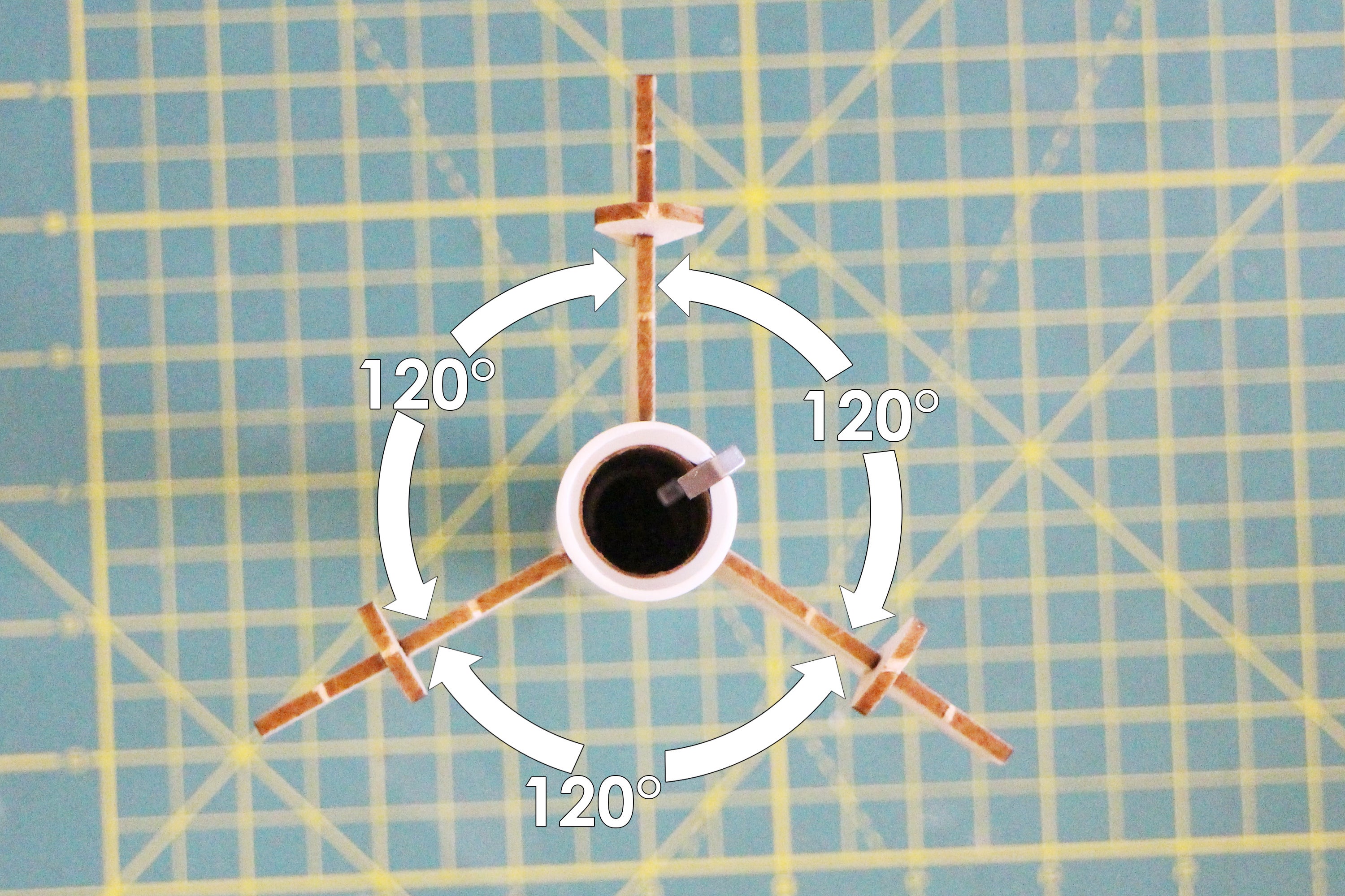 To get the best stability from the rocket in flight, it's important to make sure the fins are equidistant from each other. Looking from the bottom, down the rocket fuselage, align the fins so there is equal spacing (120°) between them.