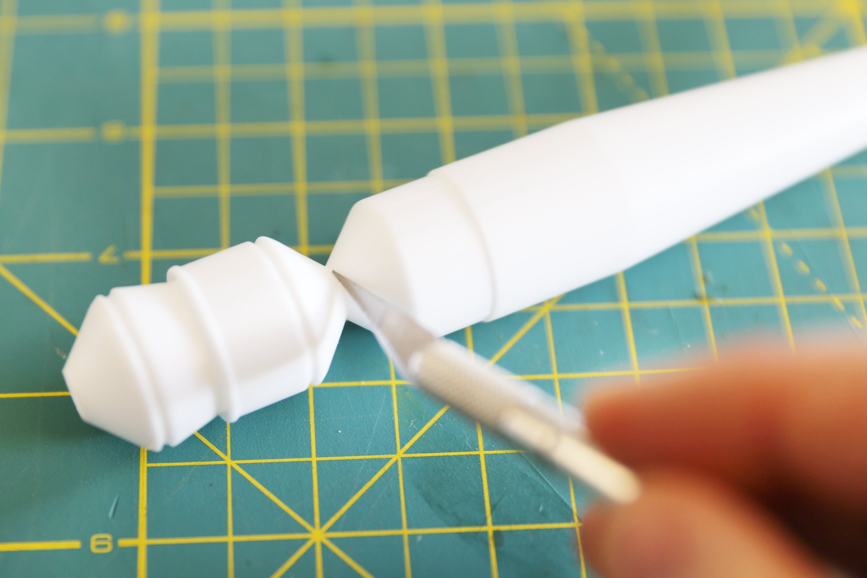 There is a fluted section between the nose cone and the engine nozzle that needs to be trimmed away. Then, another fluted section at the end of the engine nozzle which also needs to be removed using a hobby knife.