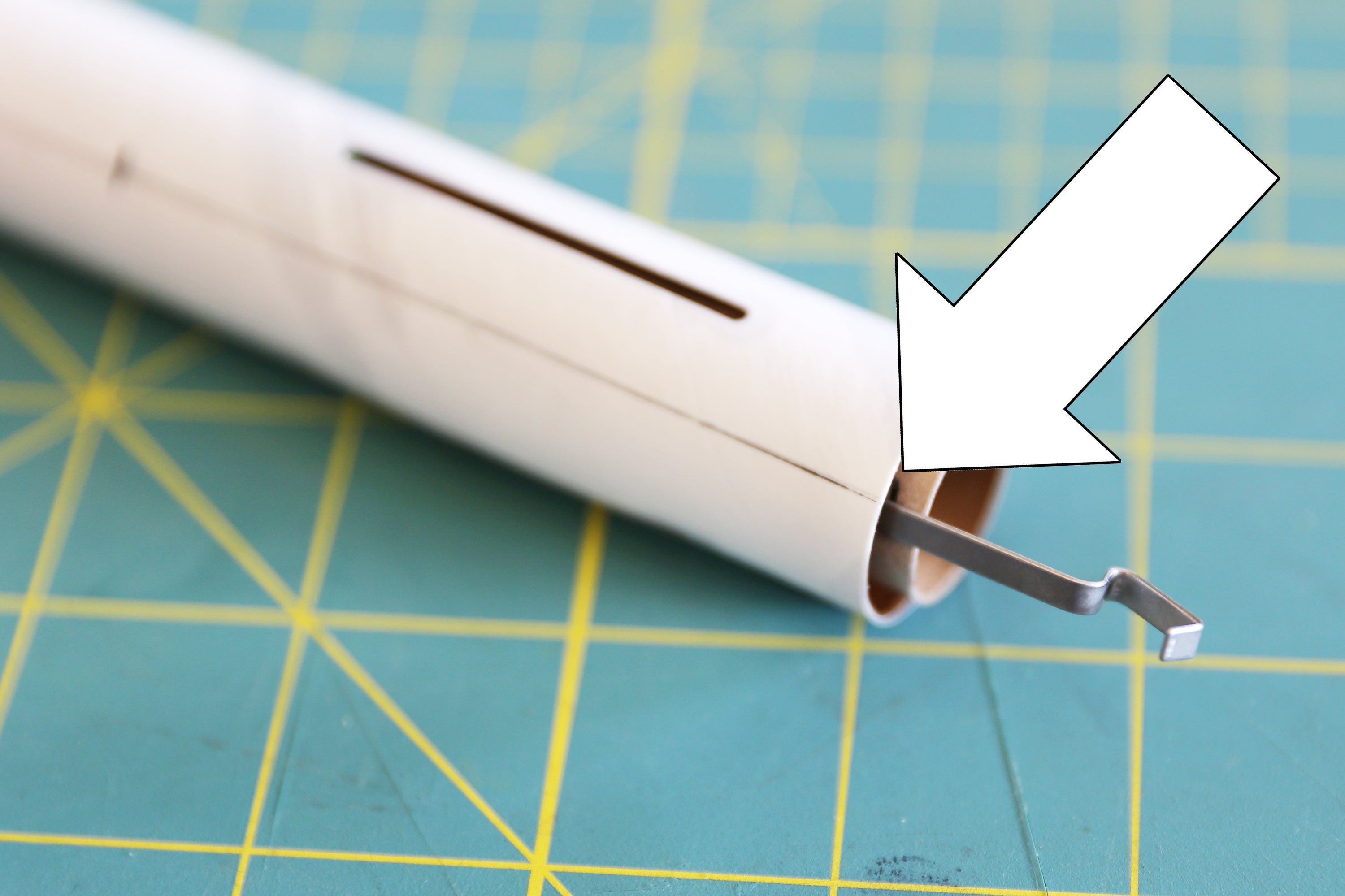 Before adding on the centering rings we'll install the engine hook. This hook's job is to push against the rocket engine bottom and keep it locked in place. To remove the rocket engine, we can just push the hook aside and pull the engine out to replace it after it's spent.