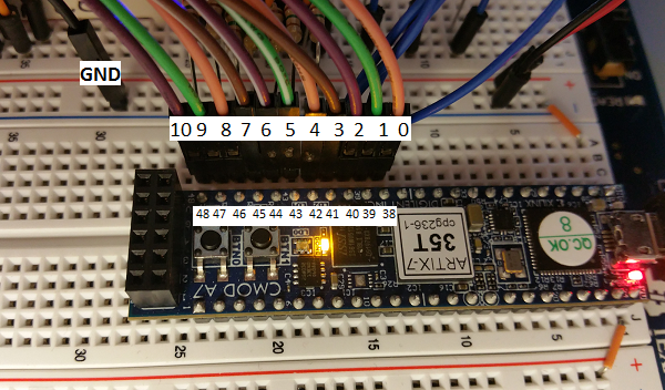 For this project I'm going to stick with the main 32-pin connector and utilize pins 0-10. Pins 0-3 will monitor the 4 cathode signals while pins 4-10 will monitor the 7 anode signals. Simply plug the fly-wires into the bread-board to make the connections. Be sure to connect one of the many GND pins (↓ symbol on the body) on the Discovery to the circuit GND as well. Below I've labeled the A7 pins as well as the Discovery pins to prevent any confusion.