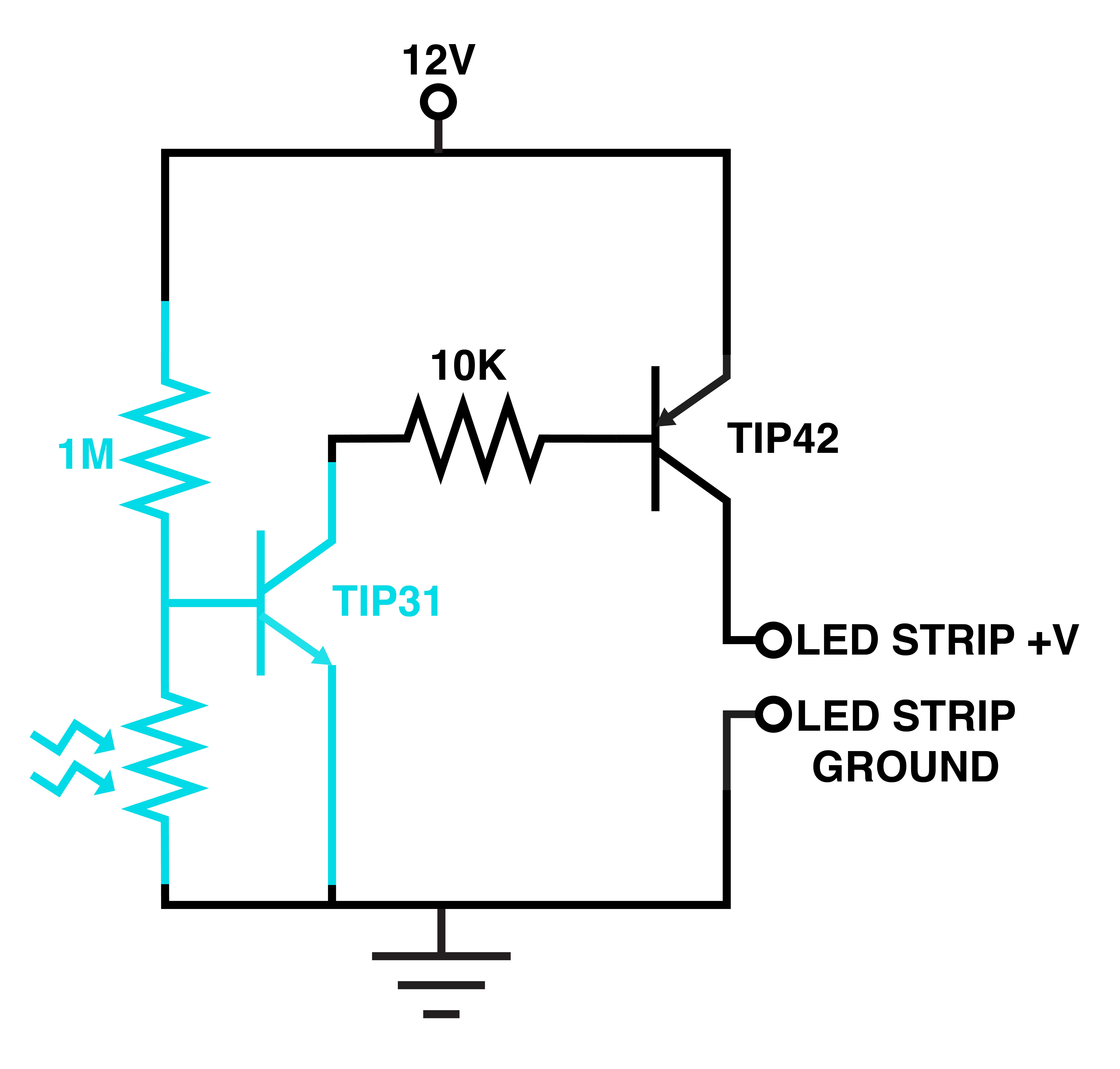 In this circuit we are using two transistors to fade an LED strip on and off. In short, the first transistor responds to changes of light, and triggers the second transistor which responds by turning on and off the LED strip.