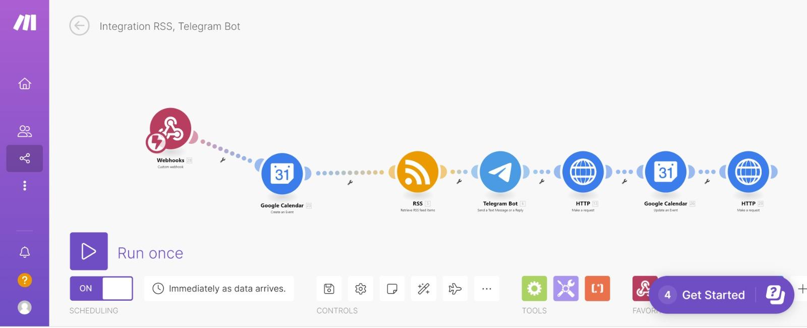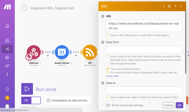 c. Add the "RSS Feed" module. Click on "Retrieve RSS Feed Items" and enter the URL: "https://www.moviefone.com/feeds/what-to-watch.rss".
