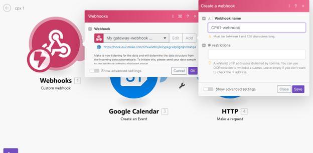 - Set up the webhook by clicking "Add Webhook" and giving it a name (e.g., CPX1-webhook), then click "Save."