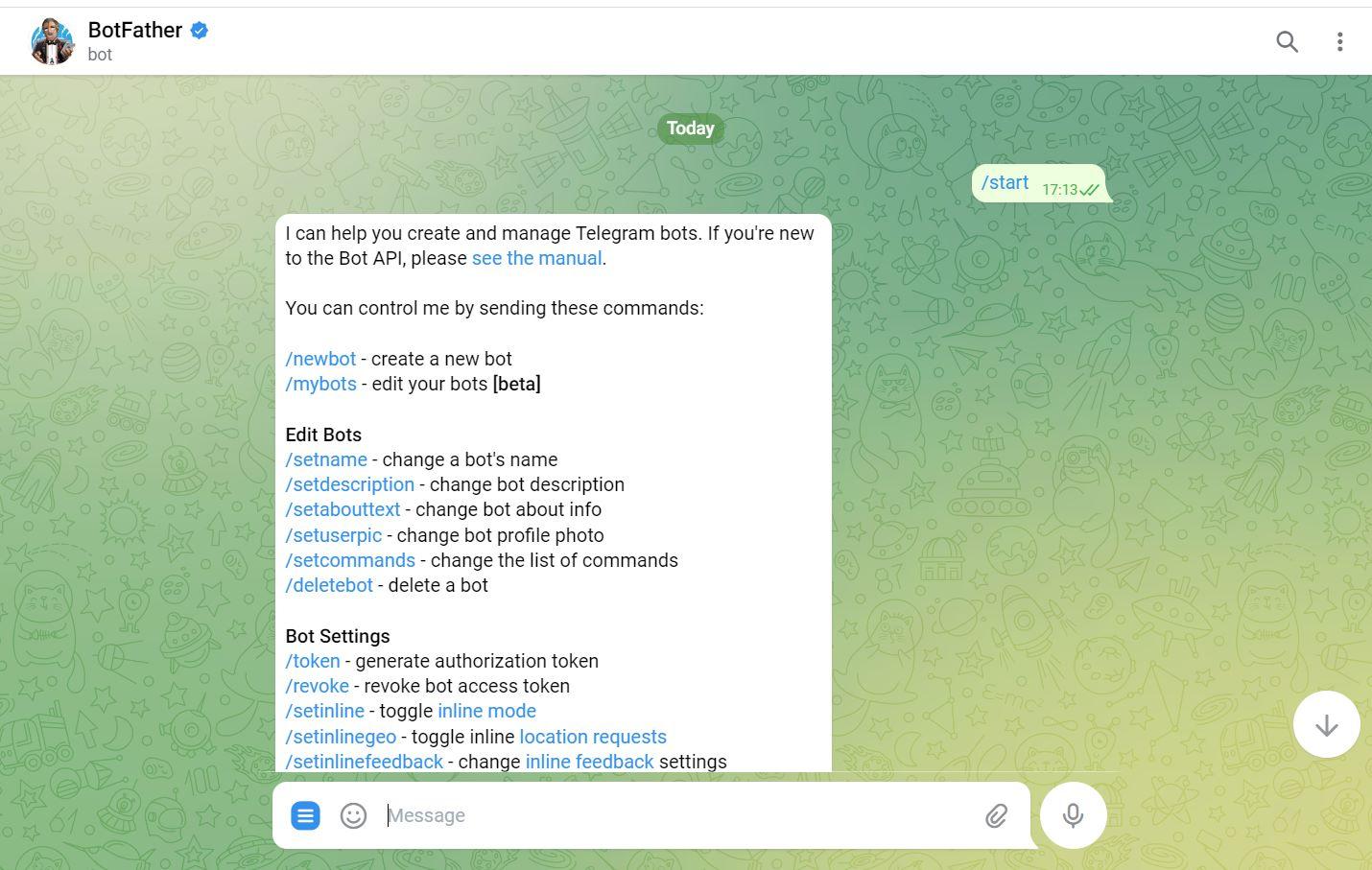 2. Start a chat with "BotFather" and send the following message "/newbot".