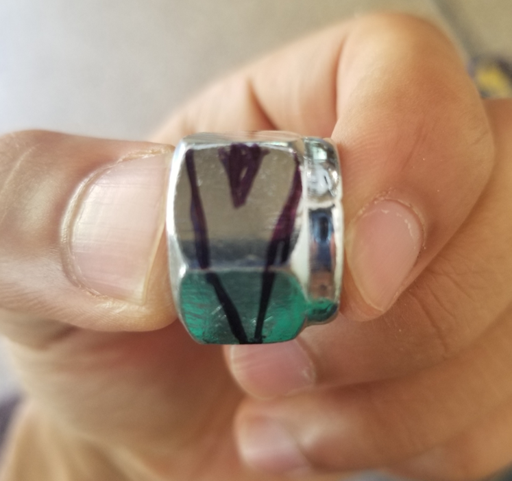I was inspired by the many hex nut ring projects I have seen online and wanted to put my own spin on it. I don’t have a lathe or mill at home, but I do have a Dremel rotary tool, a corded drill, a file, and a metal hacksaw! I am also a huge fan of Green Lantern, so I decided to make a Green Lantern ring! I have made a few of these rings now, so I have a few different projects following a similar workflow.