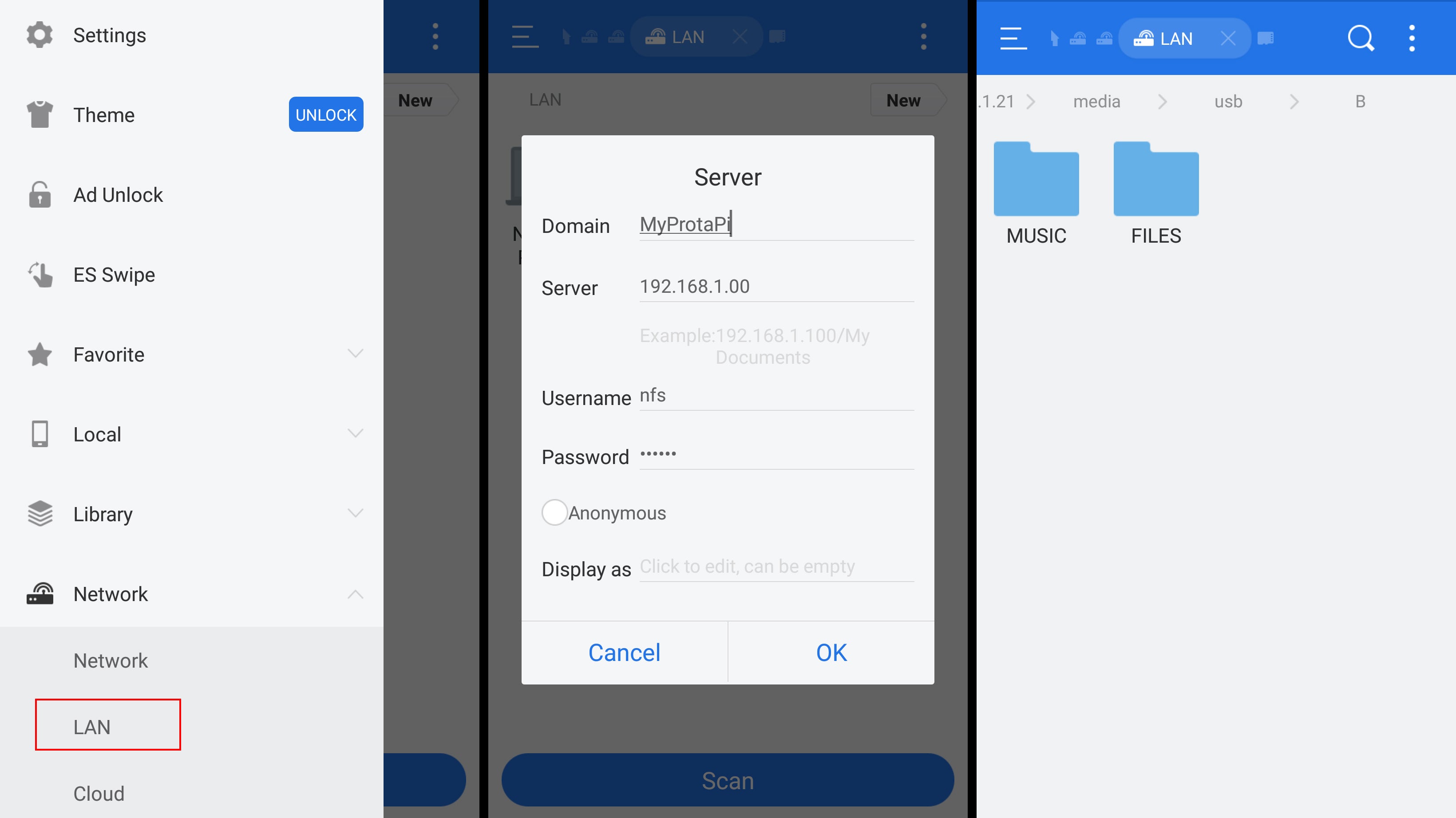 - Add a name, input the IP address of your Prota (you can find it in the top left corner of Settings app in Prota Space), the ID (“nfs”) and password of your NFS