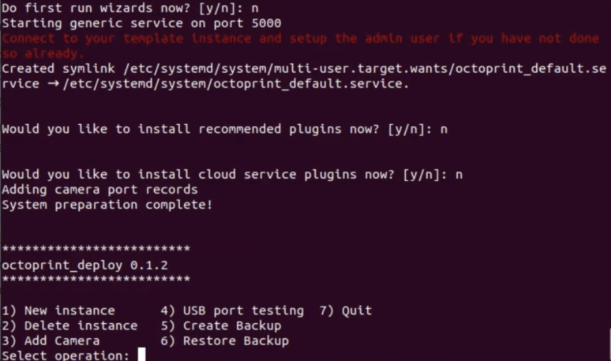 When you complete the initial setup, return to your terminal session, if you haven't yet, select no until you reach the main menu of octoprint deploy: