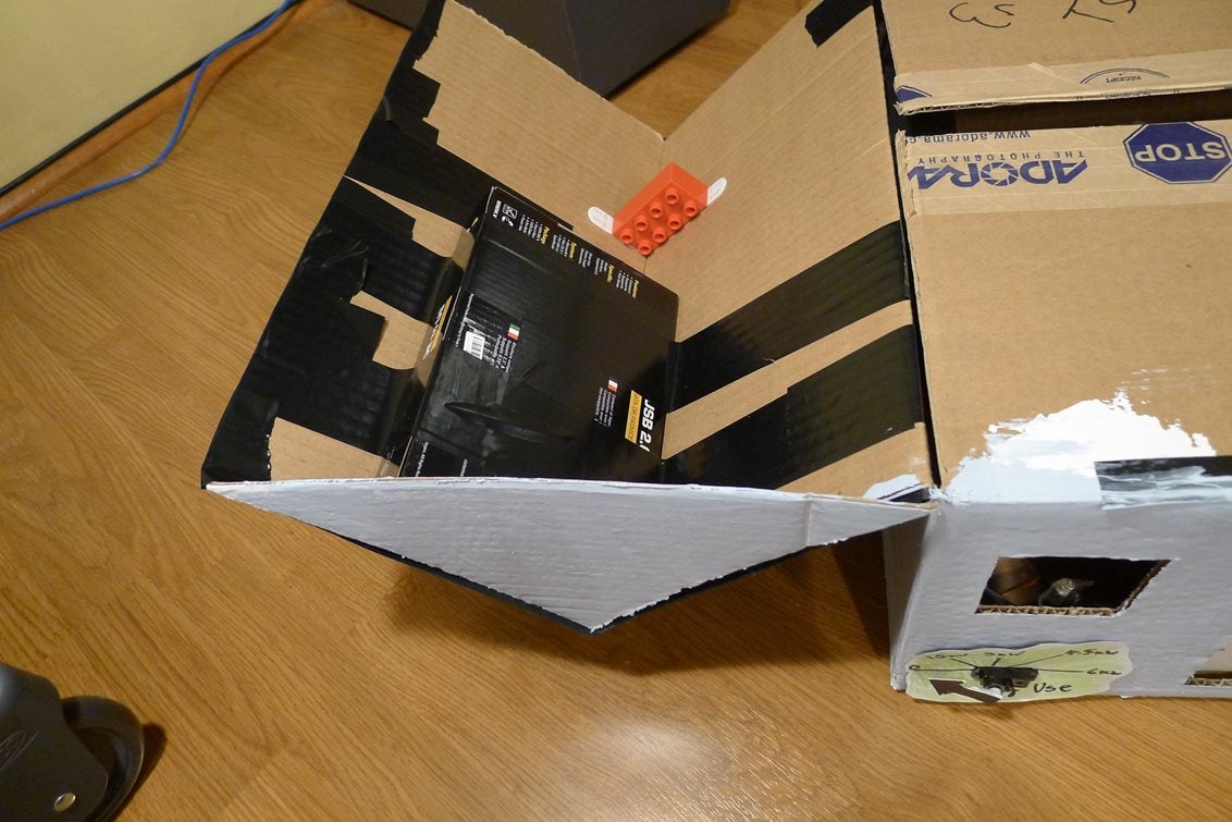 I cut out one of the side flaps of the box and attached it to the other (still attached) side flap to form a roof. I used a small box to provide a structure for the right angle, and later supported it better with a Lego piece. You can probably just use whatever you have around the house to make this right angle.
