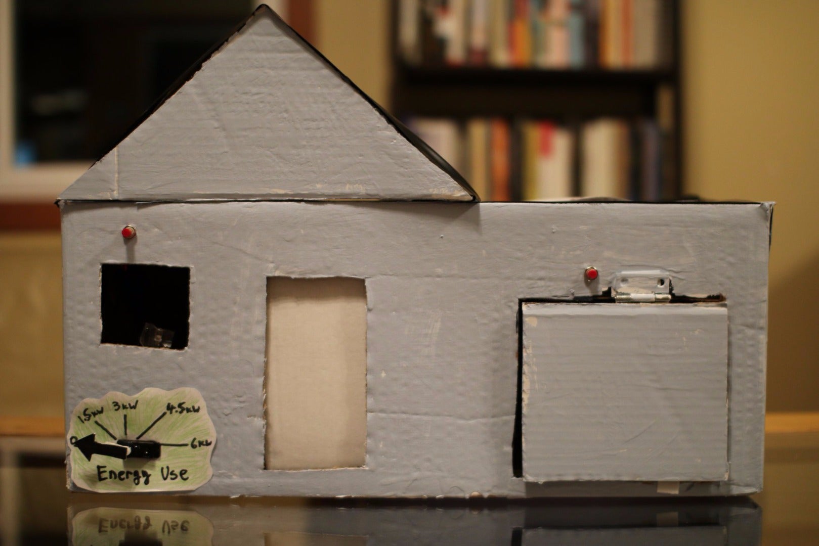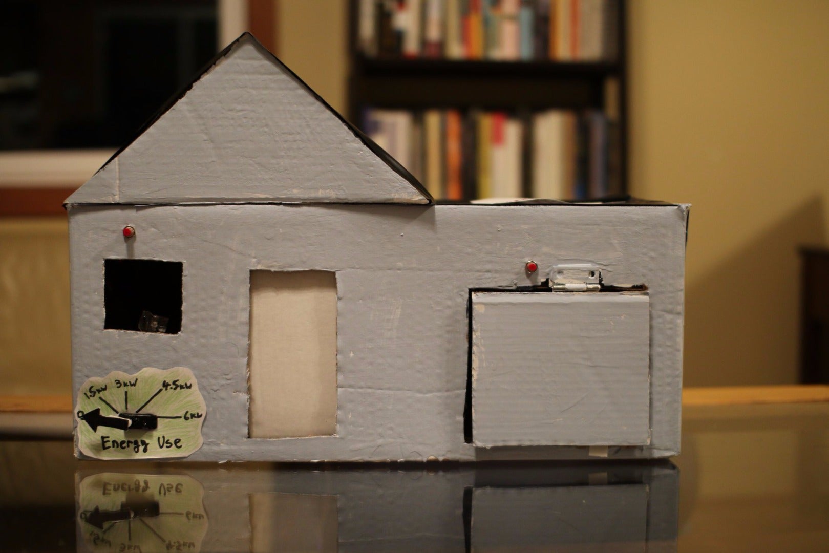 I don’t intend this step to be prescriptive. I’m pretty amature when it comes to arts and crafts, so I’ll just show how I built my model house. You’ll want to build it to resemble your own dwelling and reflect the things you care about. Lots of room for creativity here. Some of the components in this picture (like the current transformer) will be used in later steps.