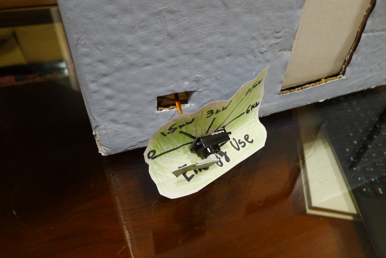 Nothing fancy. Just cut out an arrow-looking thing and attach it to the servo arm. Cut out a vaguely shrub looking shape and mark it up with a kilowatt scale, and friction fit the servo motor onto the box with the shrub in between.
