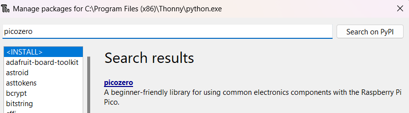 Search for 'picozero' in the search bar. Click on it and hit install.