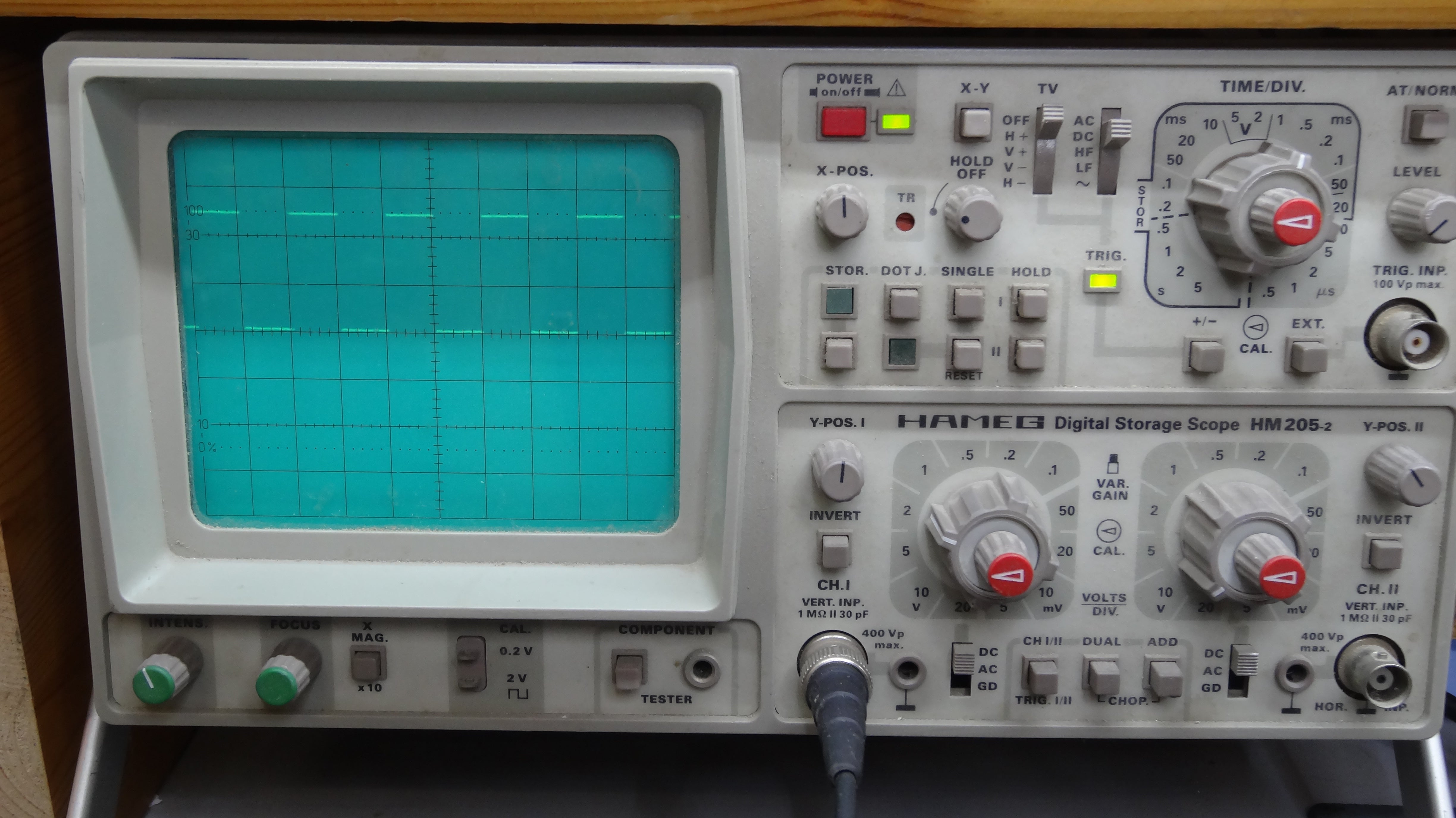 After the simulation it is always a good choice to build a prototype and test it in reality. For this test have created the small circuit on a bread board and connected it to an old oscilloscope.