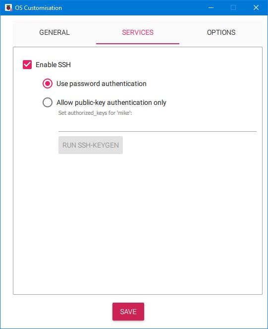 Next click the ‘SERVICES’ tab and Enable SSH and Use password authentication. The click ‘SAVE’ and then ‘YES’ to apply OS customisation settings. Then click ‘YES’ to continue to the Warning page.
