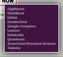 A close up on the trackers Ghostery found appear in the lower right. As I have told Ghostery to block everything, you can see that all the potential trackers have been crossed off, to show that they've been blocked.