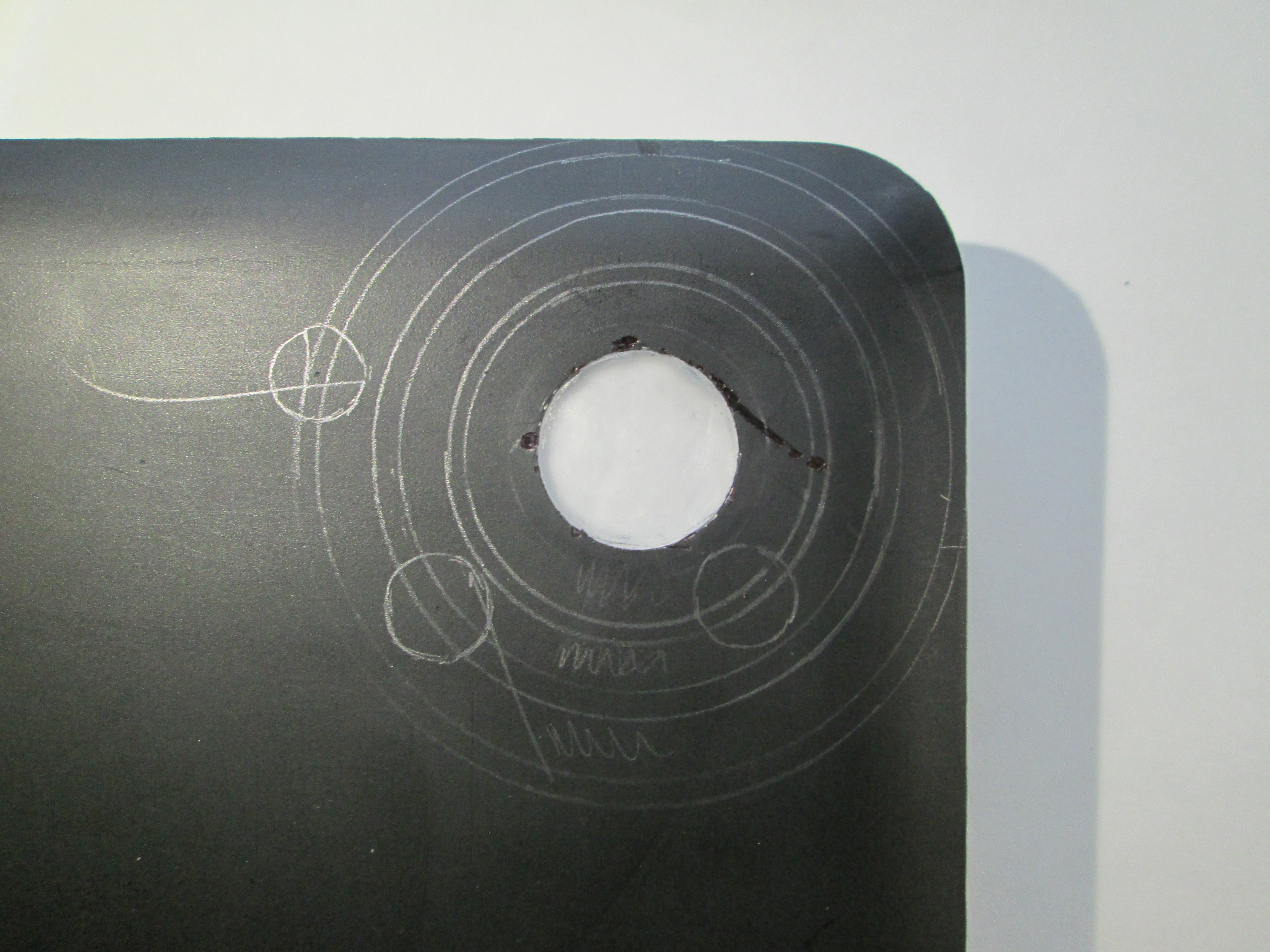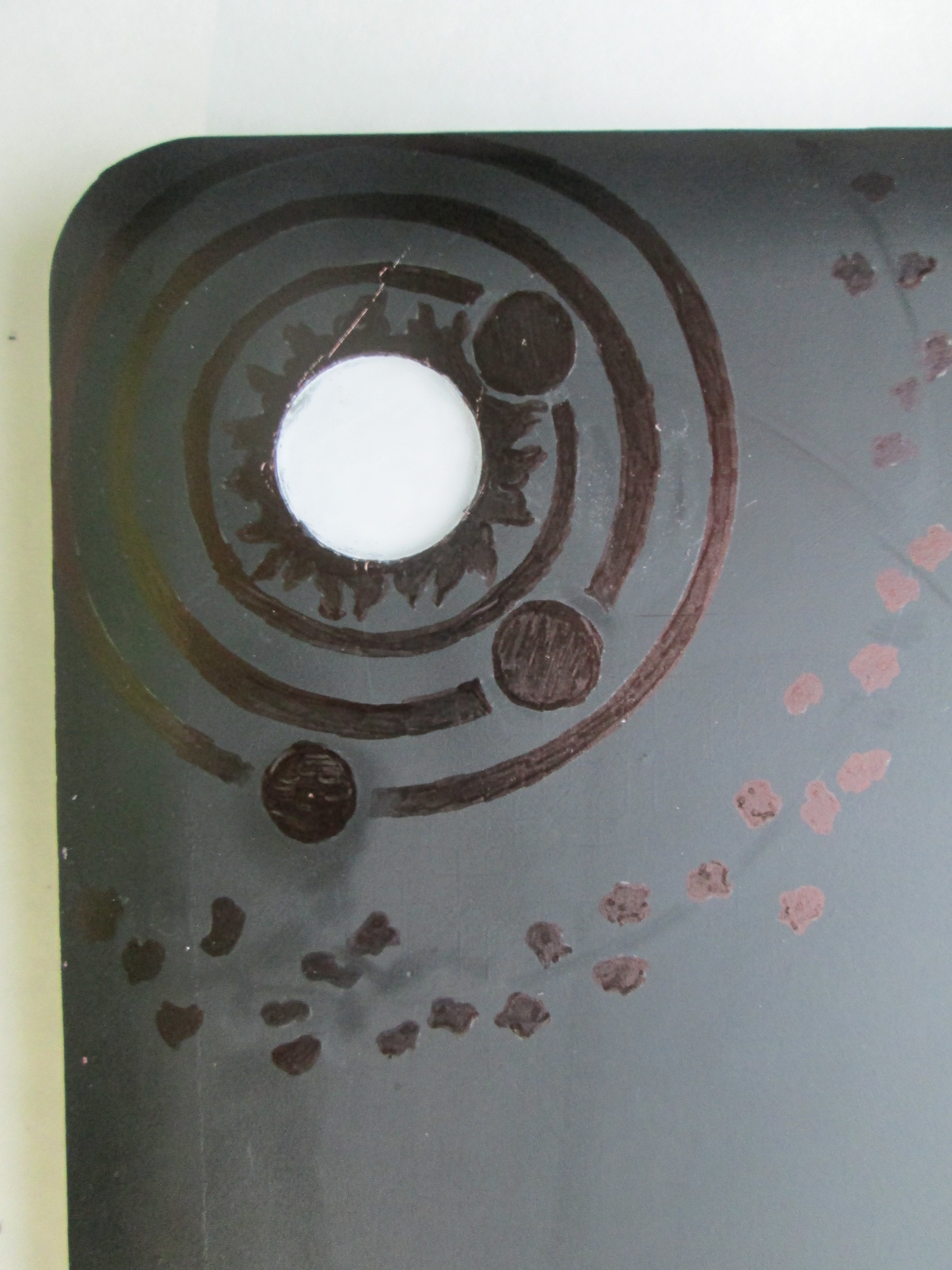 You may recall my mentioning that I fell to the temptation of removing the tape too soon, and this, combined with an accidental incision from the knife when applying tape, meant that I had to cover up a mistake. I started by using sharpie, but it doesn't do a great job of covering up the scratch, although it does help. Instead, I decided to go with it, and create a small solar system, using pencil to plan it out and then sharpie to finalize my work.