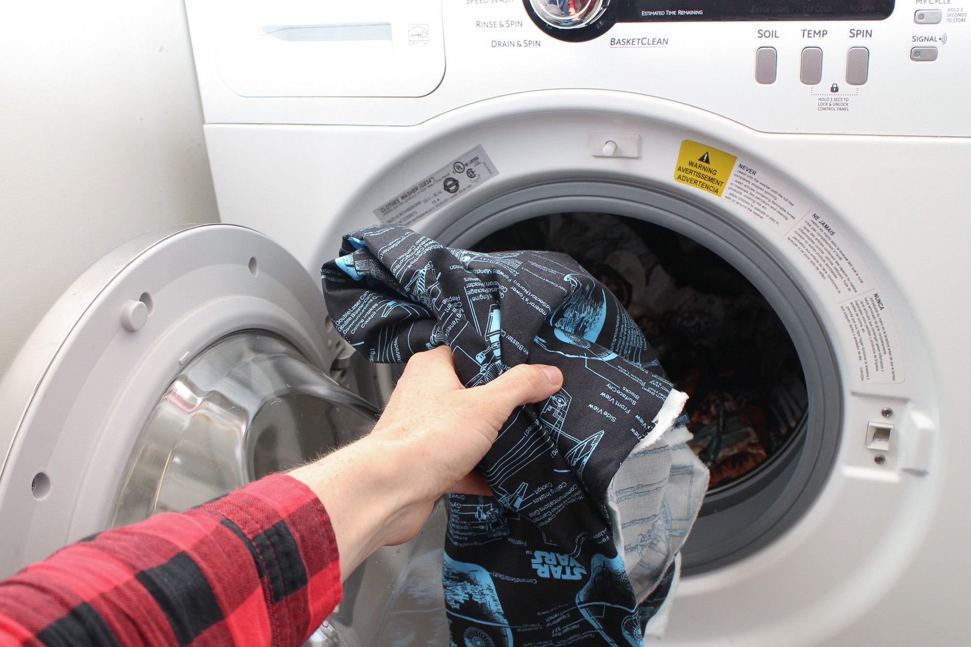 Many fabrics are treated with a "sizing" that needs to be washed out, and they can also shrink and bleed when you wash them, so before you start measuring and cutting, you need to get those transformations out of the way. If you're lucky, your fabric will have care instructions on the label on the bolt, so snap a photo of this in the store if you can. Otherwise, a good rule of thumb is that you should wash and dry all cottons and cotton blends, and wash and hang dry (or tumble dry low) all polyesters. Silks and wools should usually not be washed as it can ruin the fabric. Ask an employee in the store for advice about washing specific fabrics.