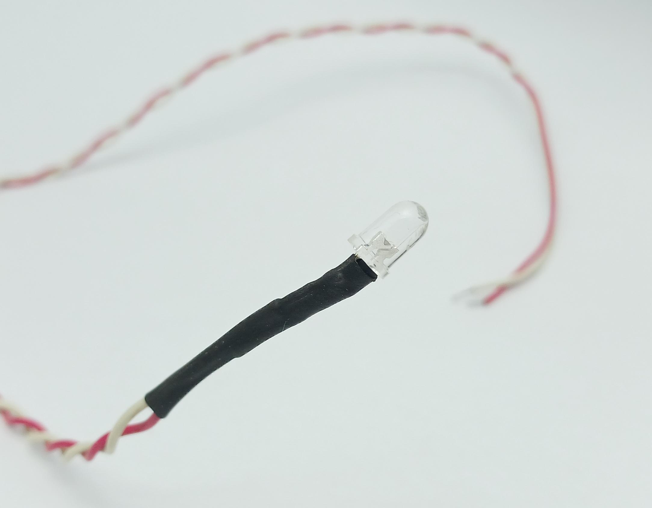 With the leads insulated you can now feed the wires through the copper pipe and adhere the 5mm LED to the end of the pipe using some CA/super glue.