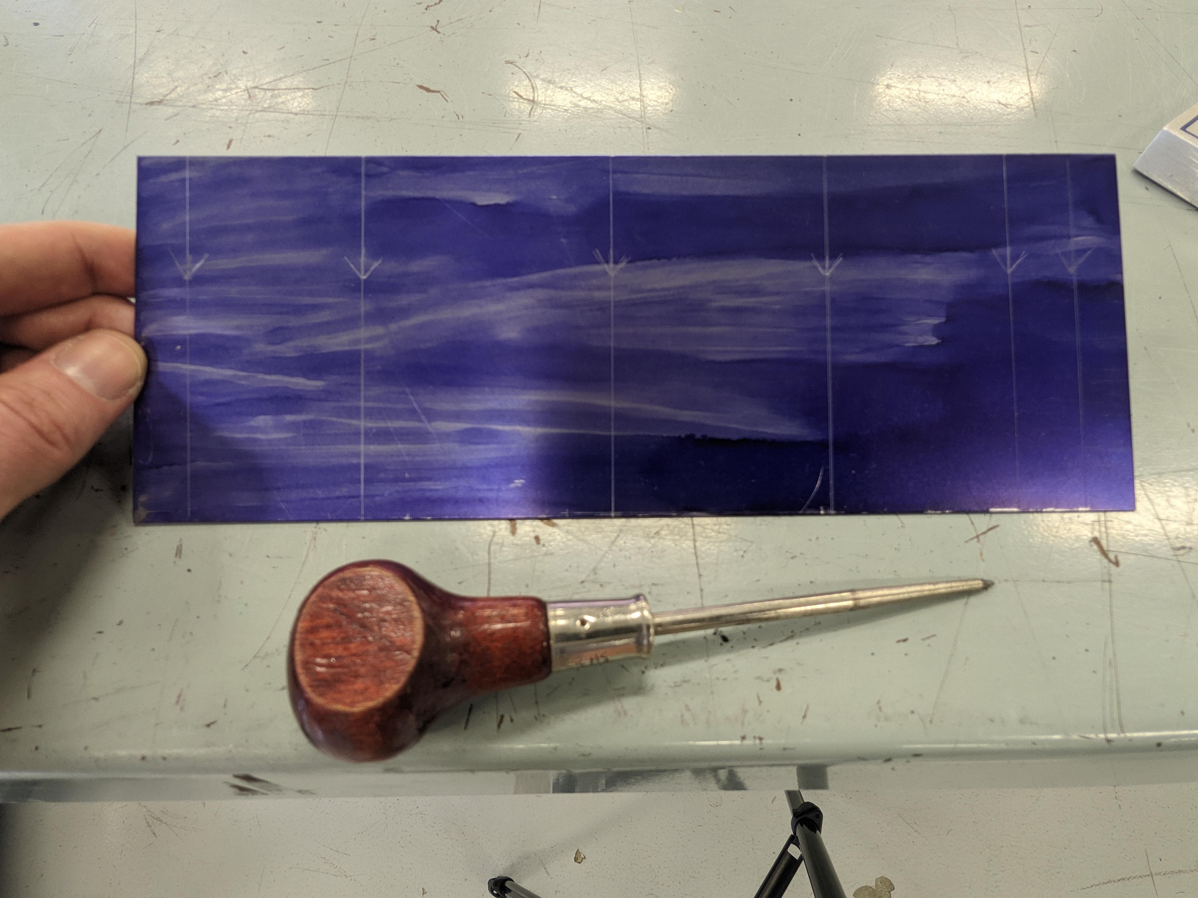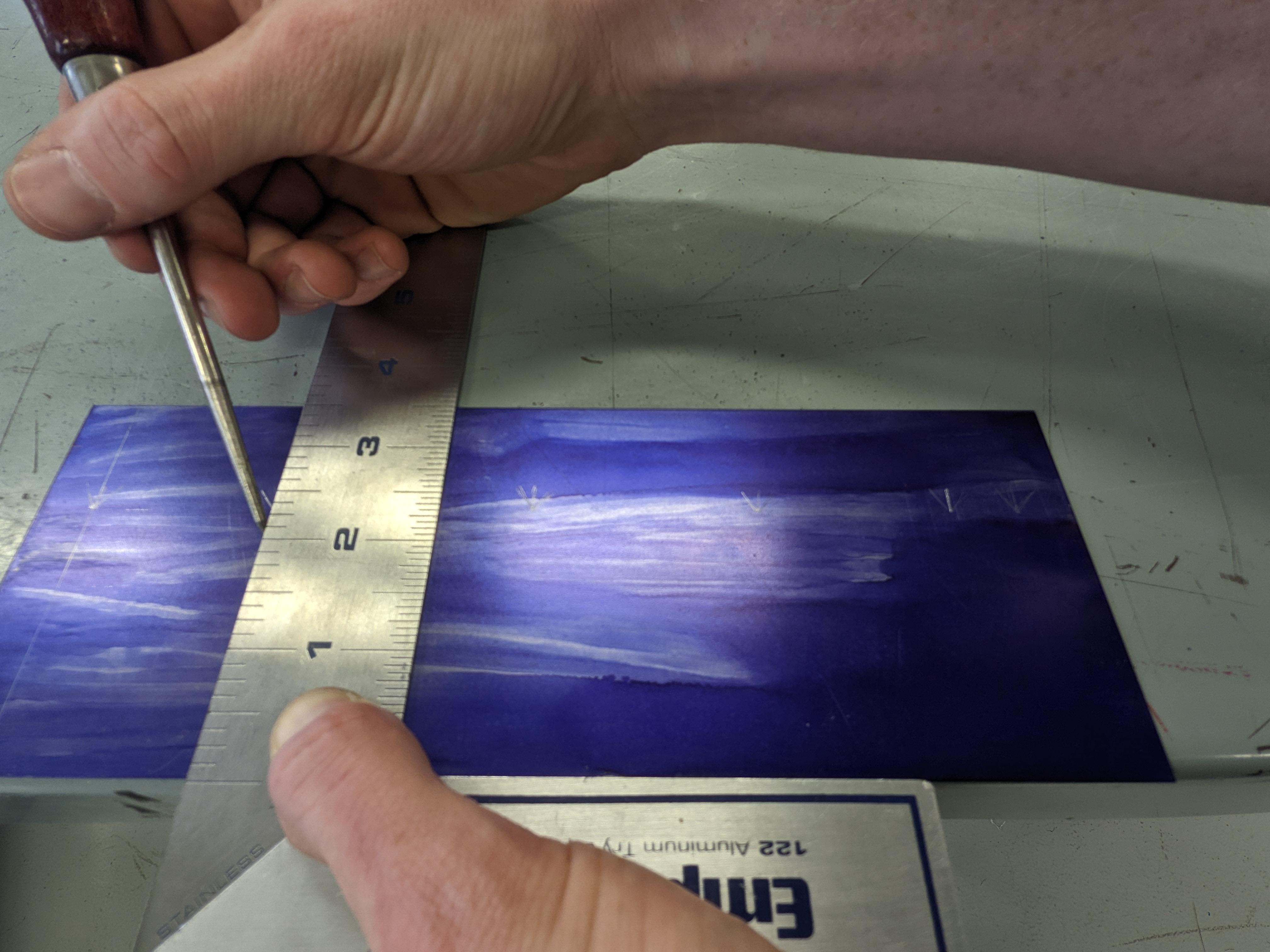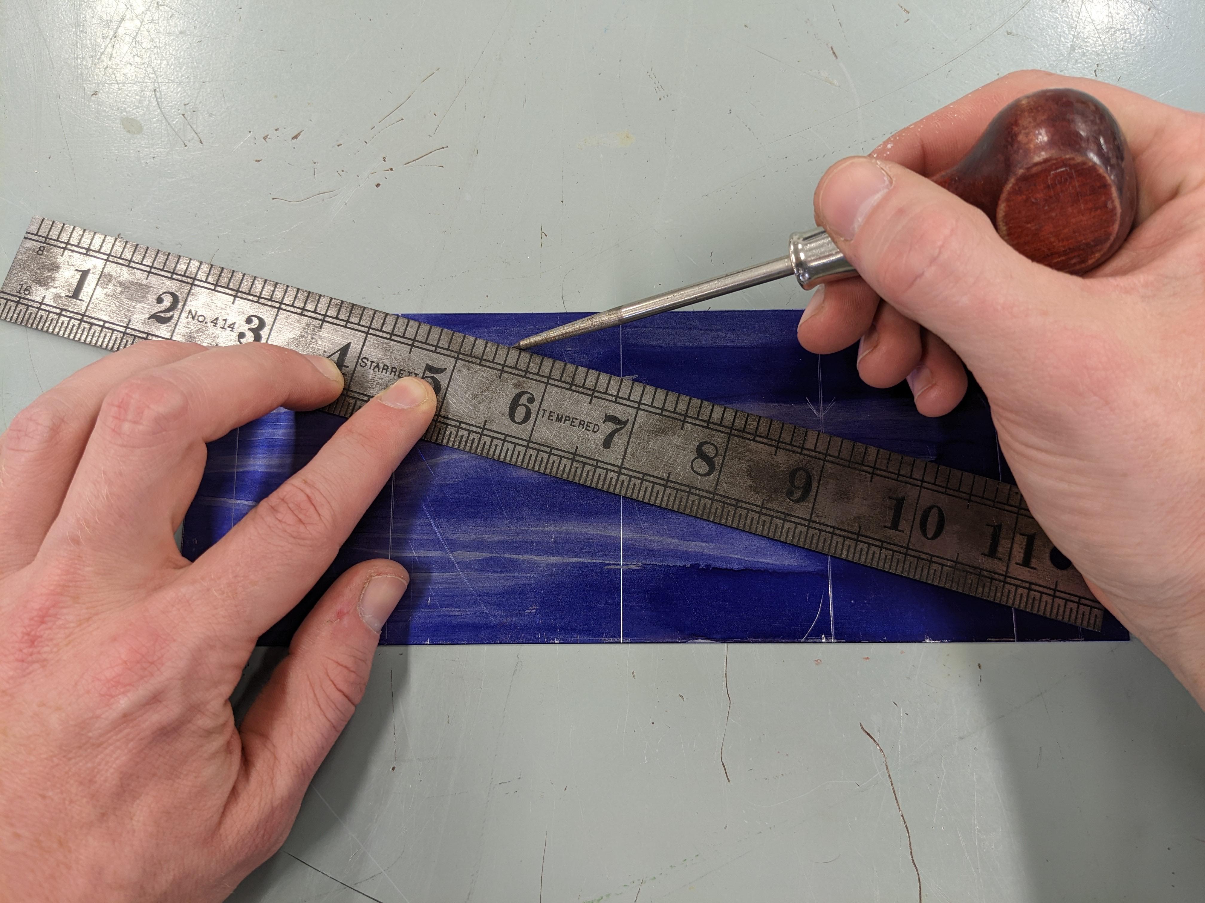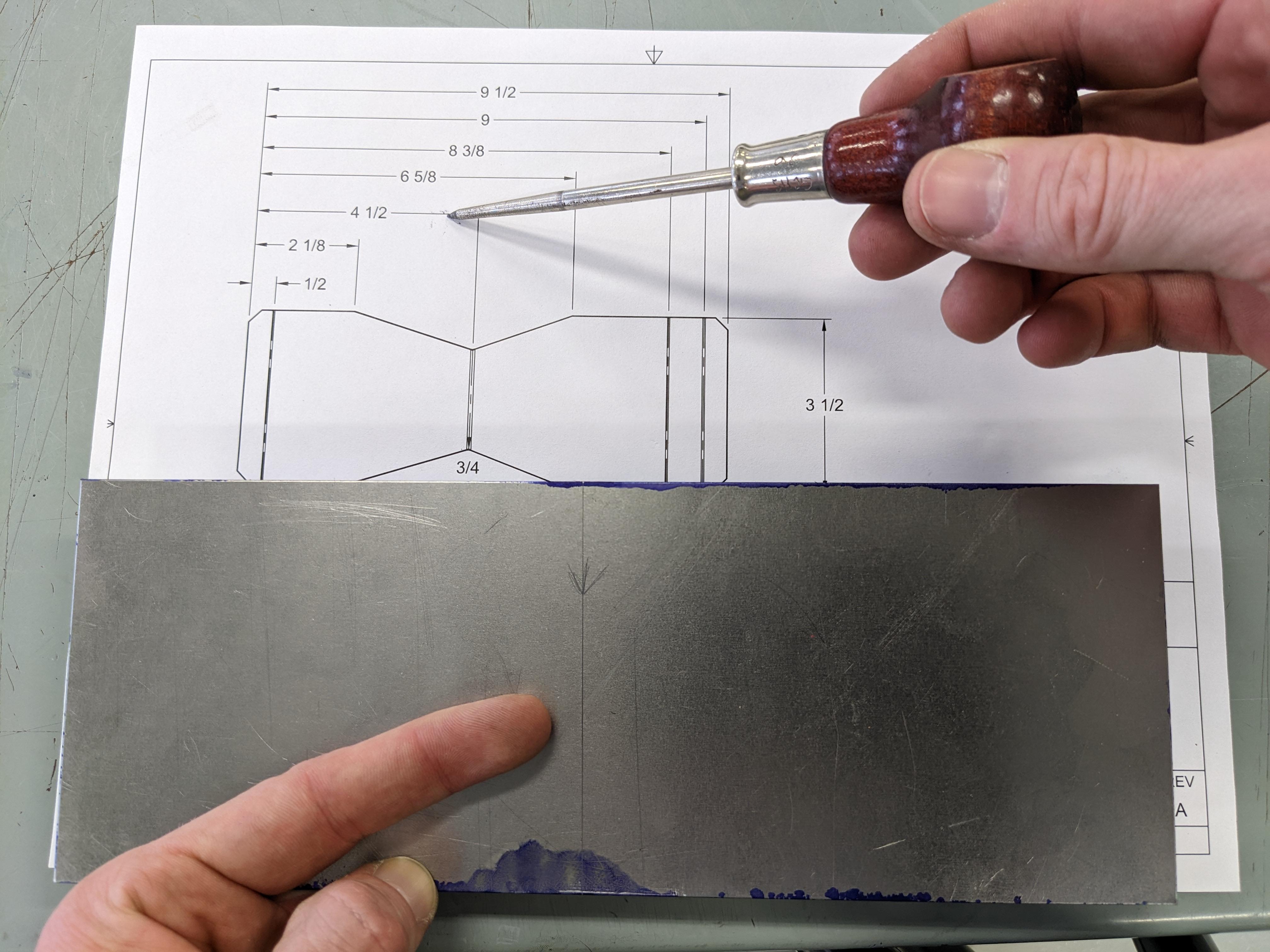 With your set of plans in hand, use your rule, try square, and scratch awl to measure and mark all of your layout lines onto your piece of metal.