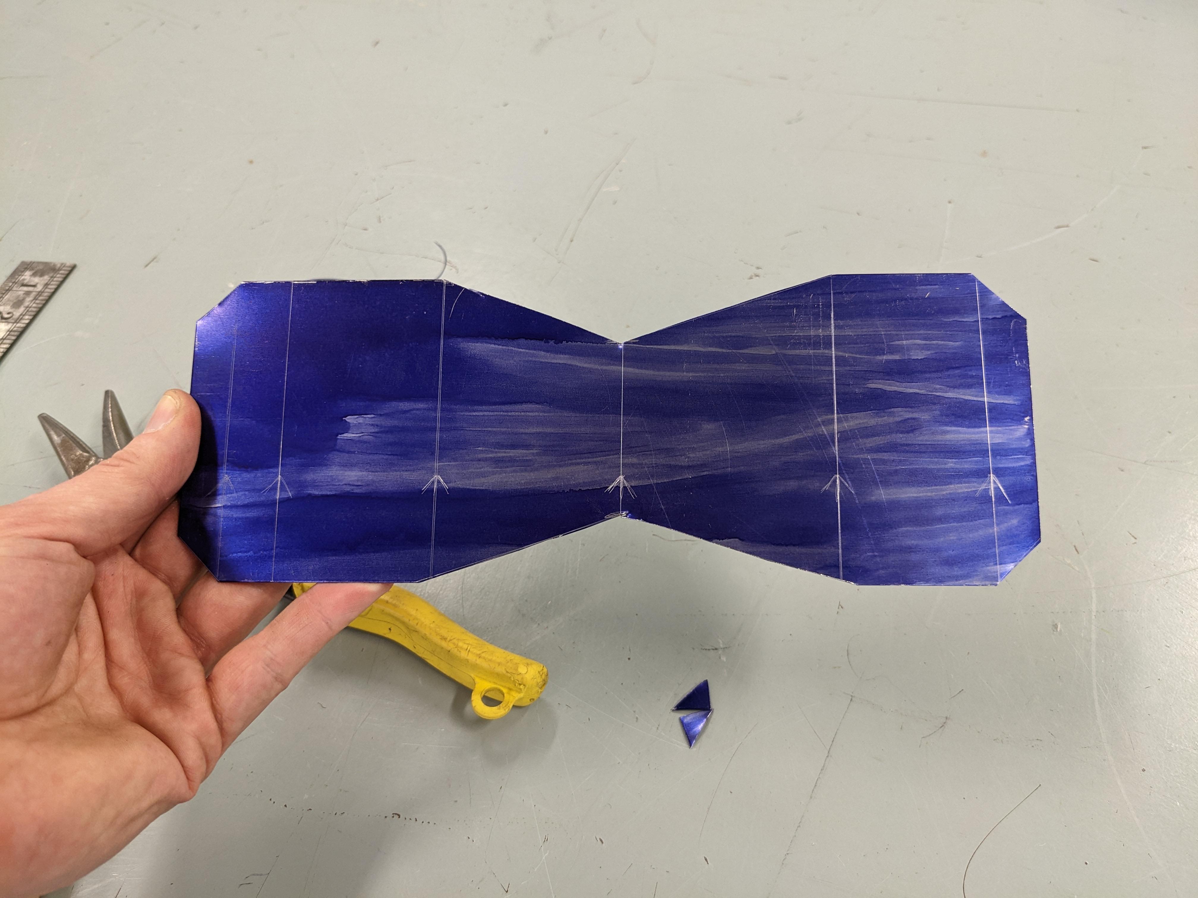 This step is pretty quick. Use your aviation shears to trim off the corners of your metal to the 45 degrees you marked earlier. And then cut out the big, shallow tringles in the middle of your metal.