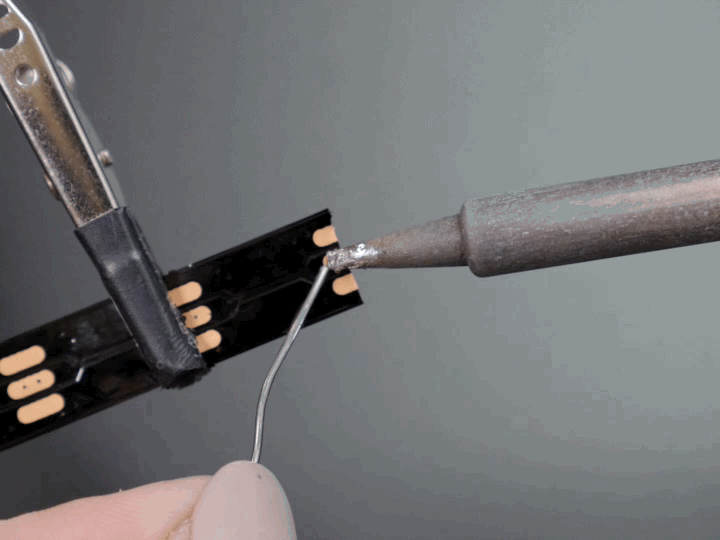 Cut a piece of your NeoPixel strip 19 pixels long, using your flush diagonal cutters to clip straight across the middle of the copper pads. Remove it from the silicone sheathing and identify the input— the arrow markings on the strip point away from it. Clip the input end it into your third hand tool with the back of the strip facing you. Tin the center copper pad by touching your soldering iron to it, then applying a small amount of solder. Move your tip around the copper pad to spread the bead of solder around.