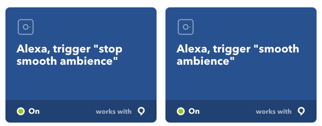 - When saying “smooth ambience” to your voice assistant (Google Home, Amazon Alexa), trigger your main lights to be turned off, your LEDs and Philips Hue to turn on and smooth music to start playing