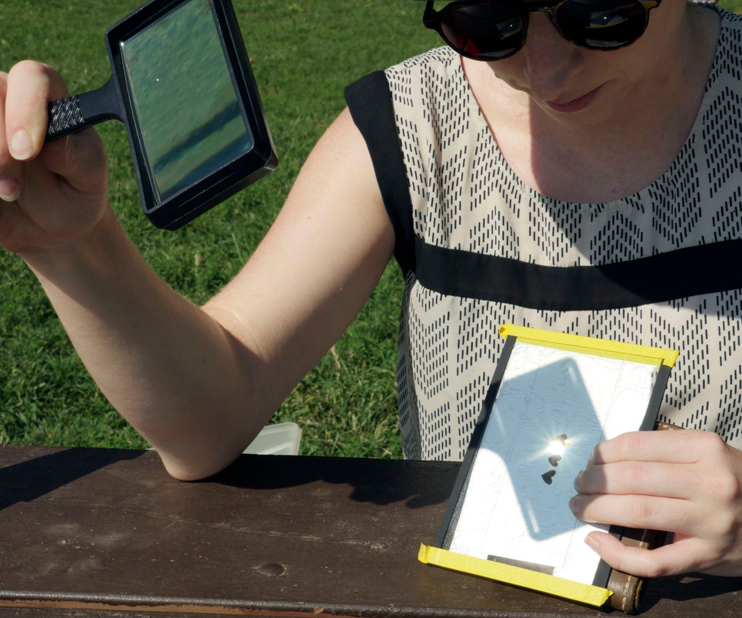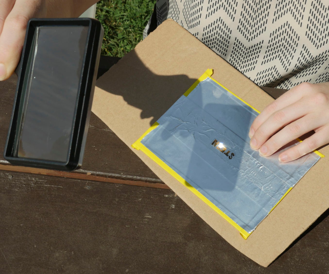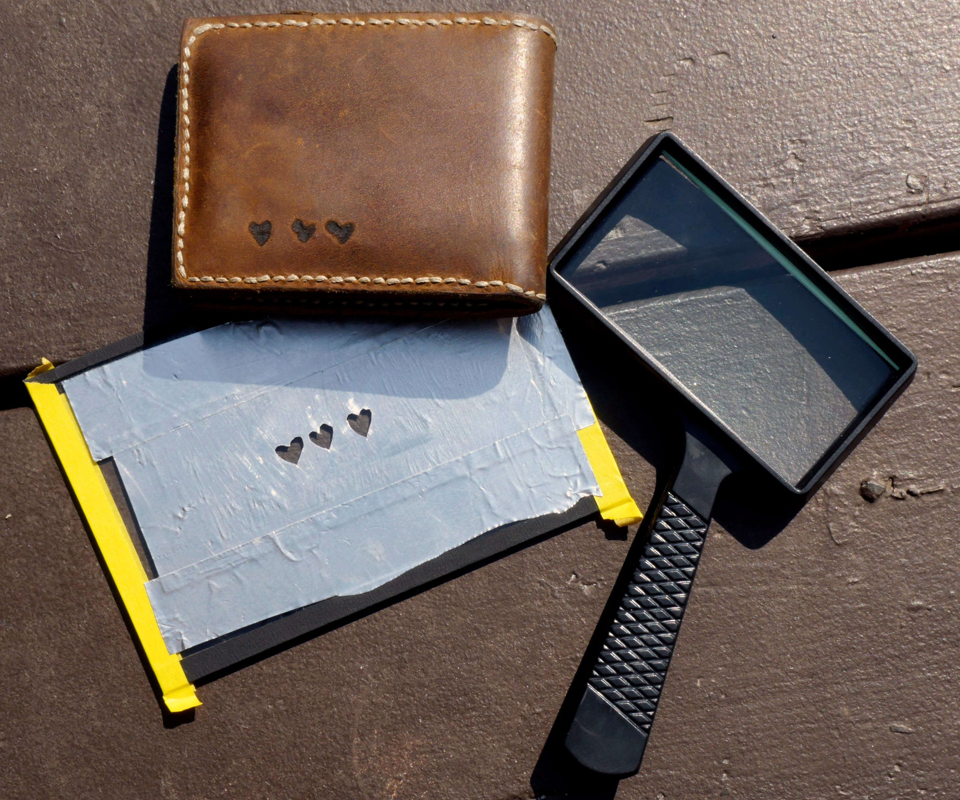 Take your new stencil, magnifying glass, and some materials with you to a bright and sunny spot where you can easily tilt your work to directly face the sun. This technique works great on leather, cork, and cardboard, and will also engrave wood with a little extra time.