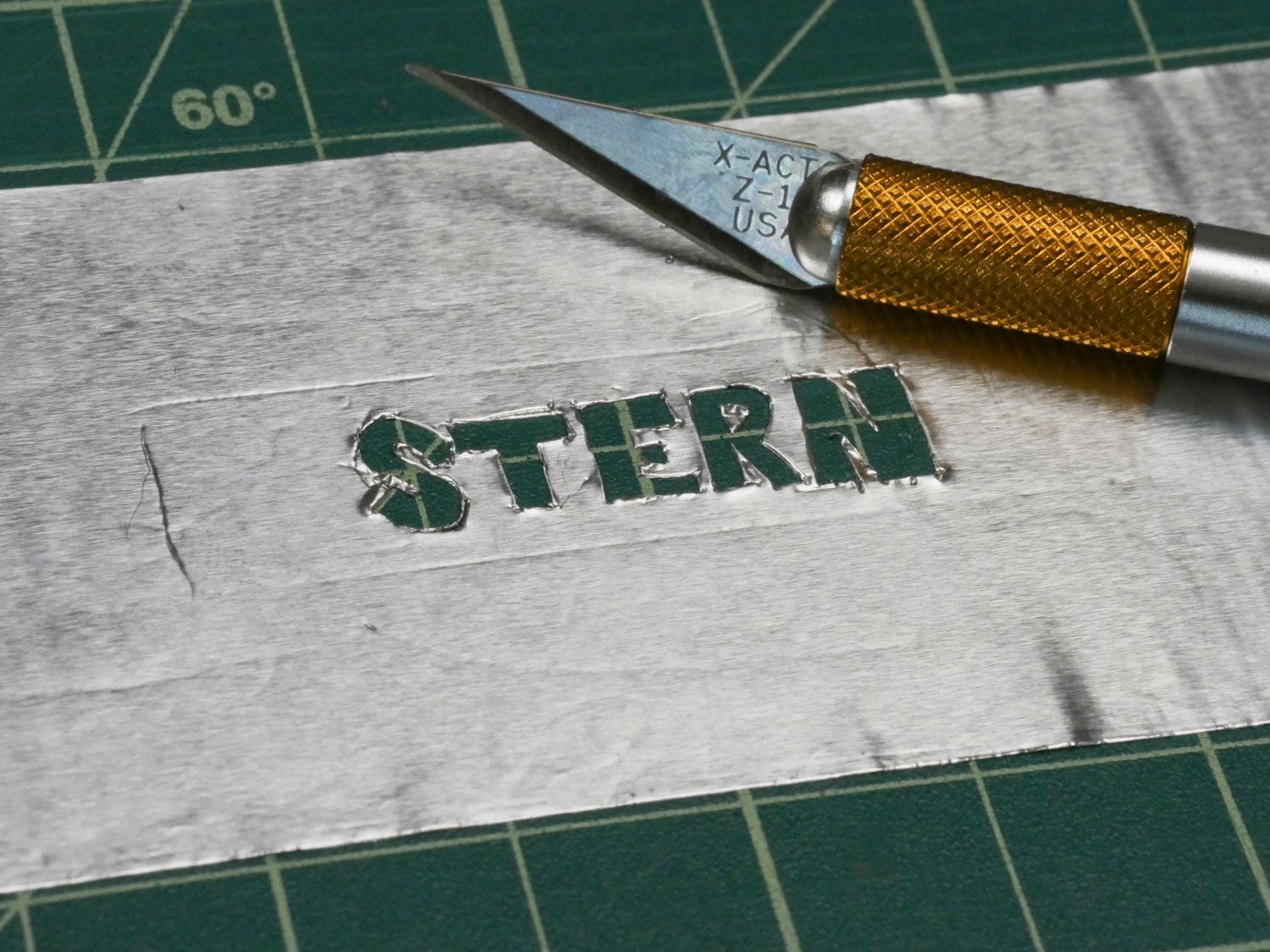 If you place your stencil tape-side down, you'll get crisper lines at the edges of your engraved areas. This requires a symmetrical design, or cutting your design backwards at the stencil stage.