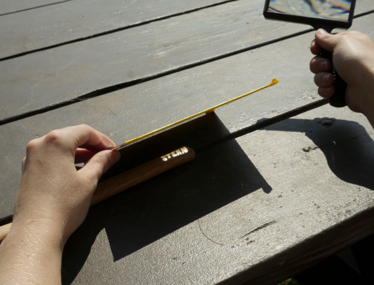 It's significantly easier to execute this technique when you can tilt your work towards the sun, which means it's easier to engrave flat, simple shaped objects than, say, the handle of a hammer. You should only engrave organic materials. Don't engrave plastics or other synthetic materials, which may produce harmful fumes and/or melt rather than engrave.
