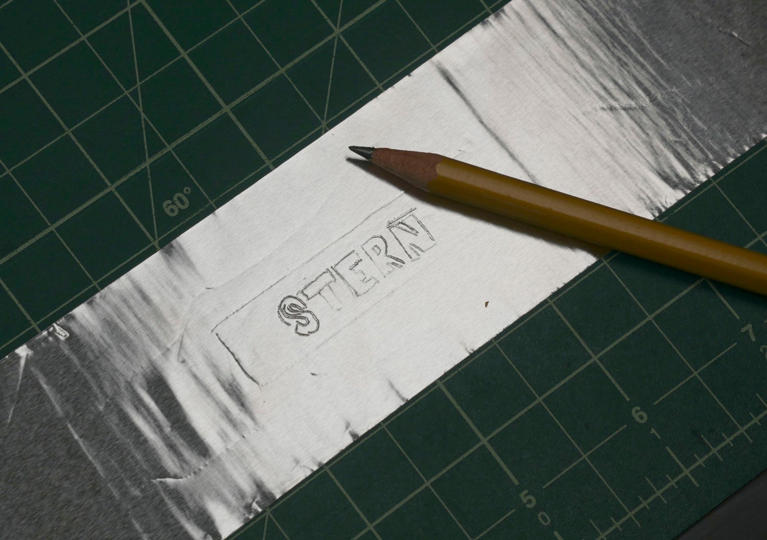 Draw and a simple design of your choice on the aluminum tape. You can use a pencil or the sharp tip of an awl— anything pointy will do. You can engrave slightly crisper lines if you place your stencil tape-side down, which requires cutting out your design backwards if it’s not symmetrical.