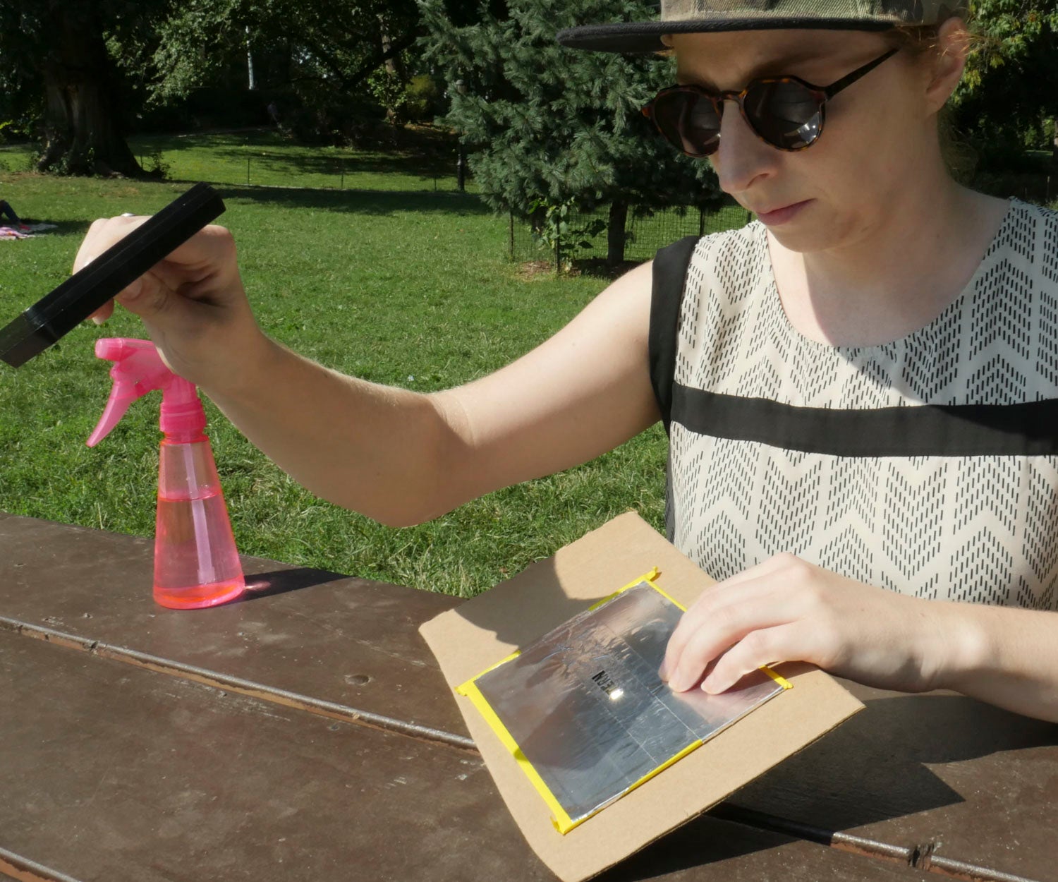 See how it's hard to hold the stencil and the hammer up to face the sun? Consider creating a jig to hold your object if it isn't easily held at an angle from your work surface.