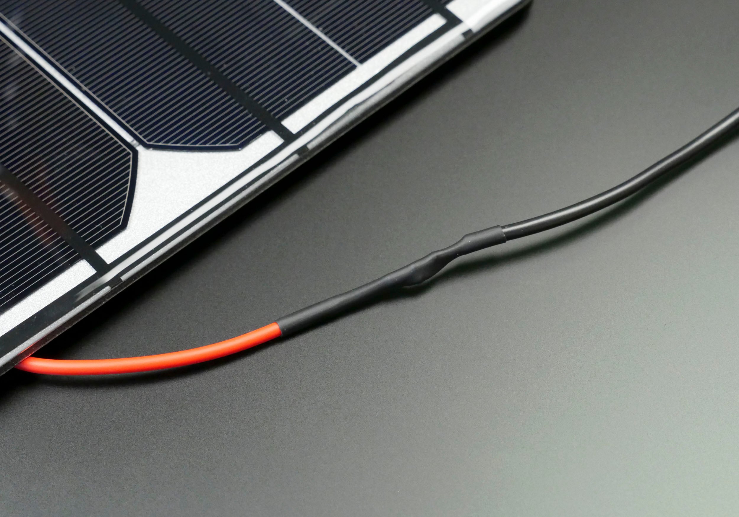 For the cleanest end result, cut the wires asymmetrically as shown. Solder the inner wires, matching red to red and black to black (or white to black as in my case), then heat up the heatshrink tubing to insulate the solder joints.
