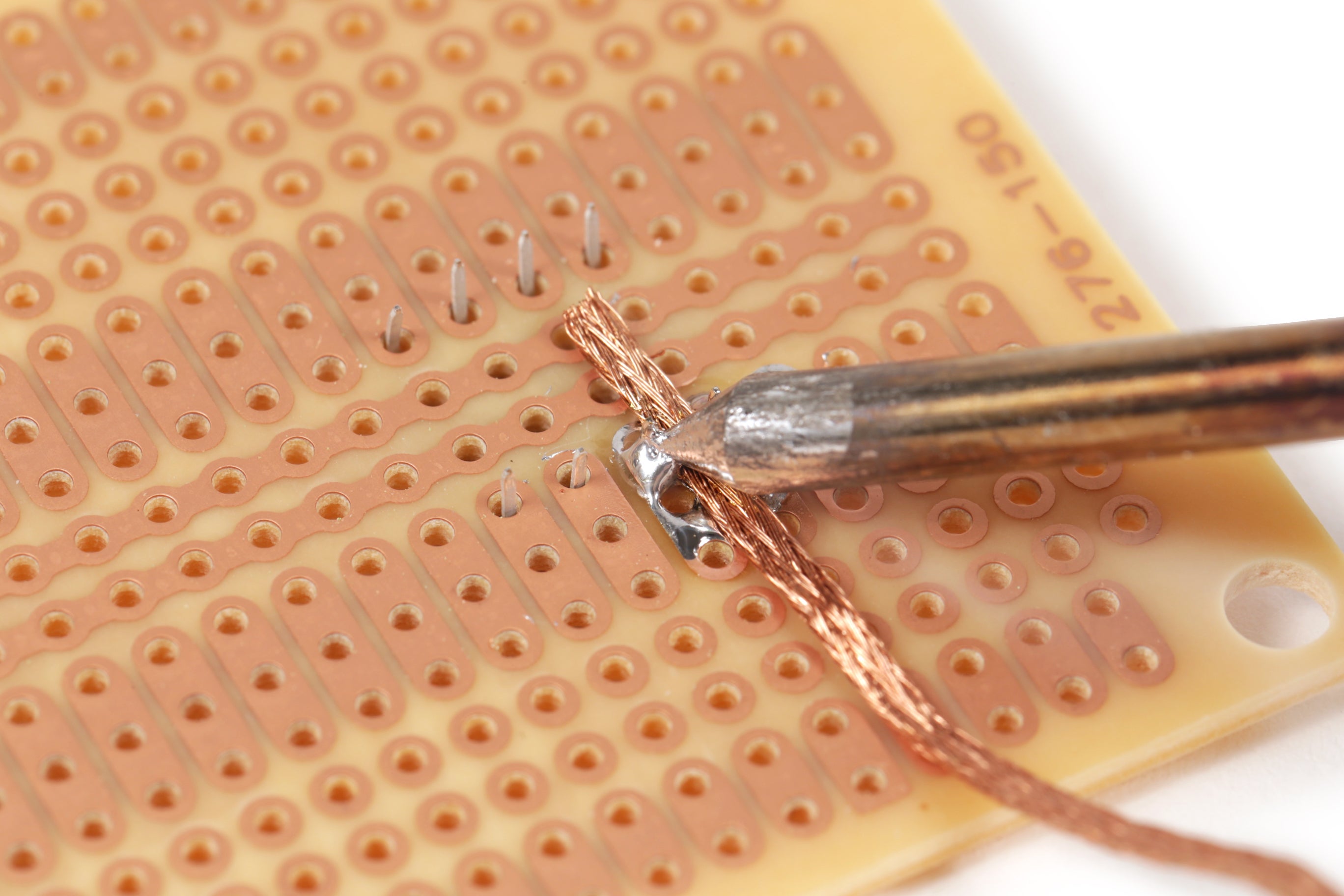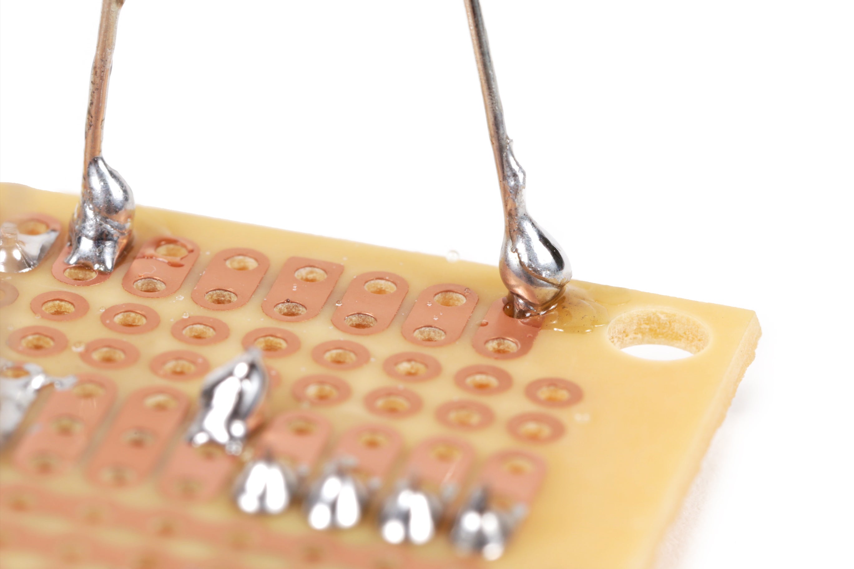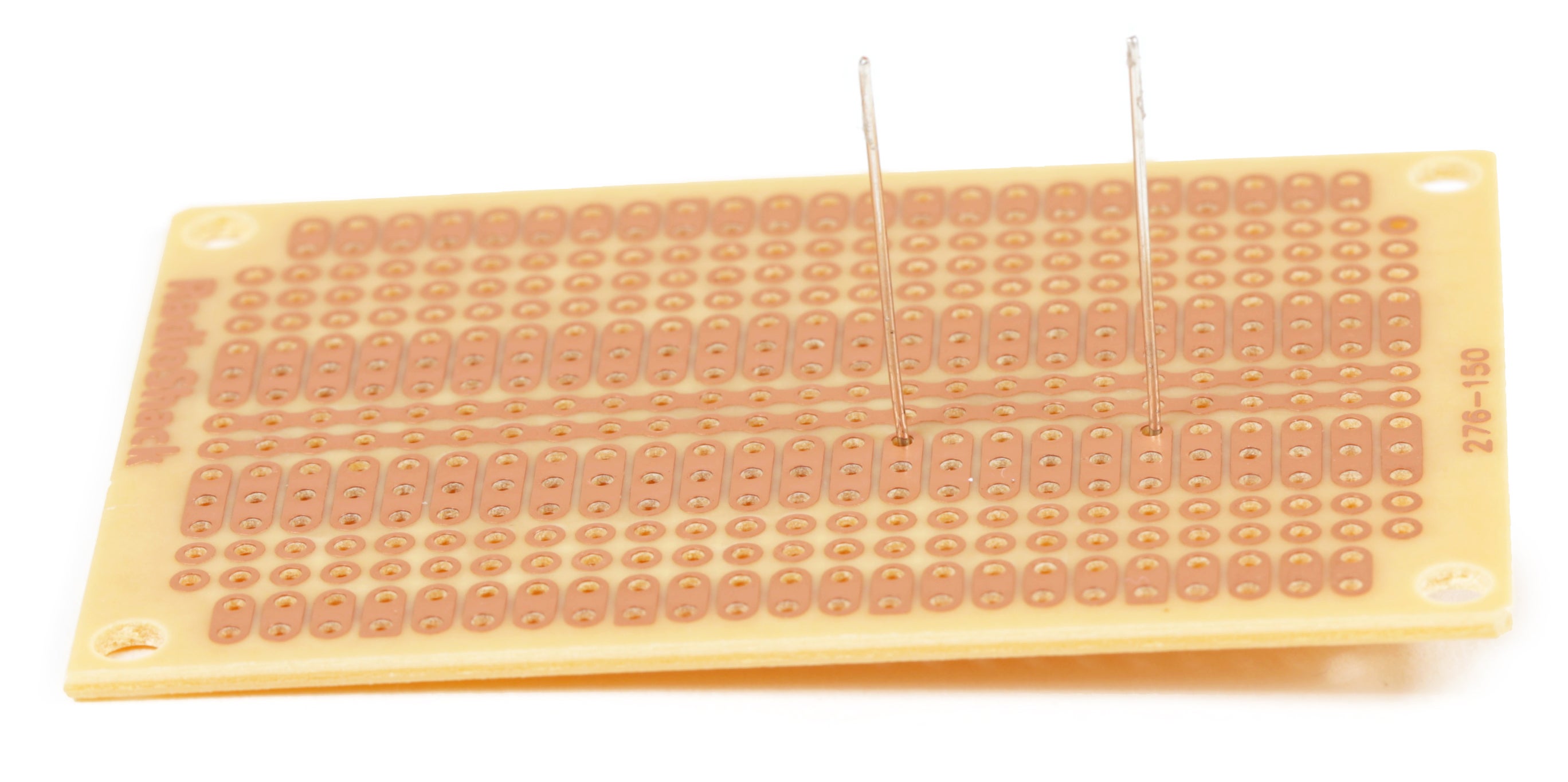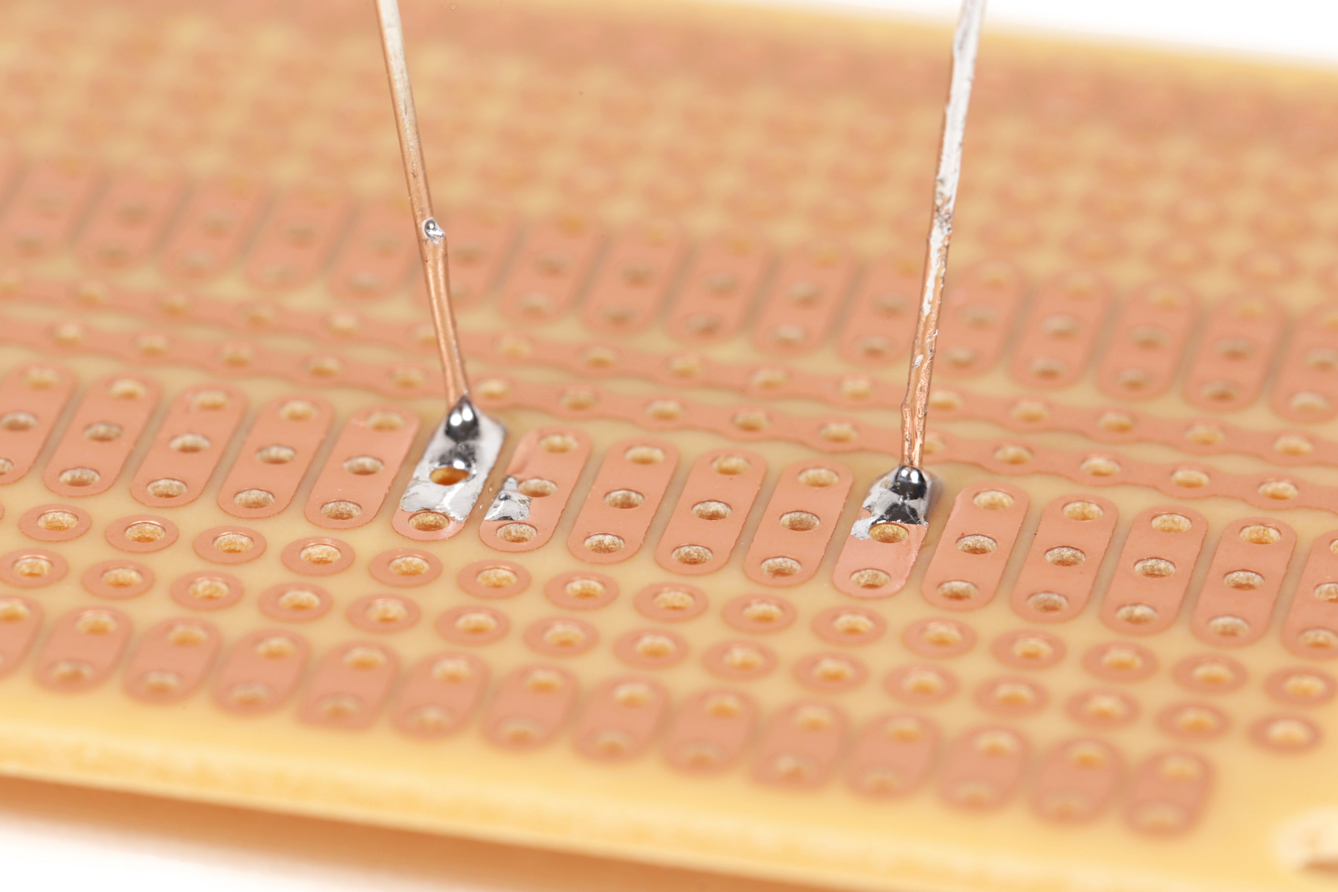 There are two types of printed circuit board or PCBs you will encounter when prototyping. There are boards with bus pads, where multiple holes are connected together electrically with a single piece of copper. There are also boards with individual pads. These require you to make connections between components by bridging the different pads with wire, or sometimes just solder.
