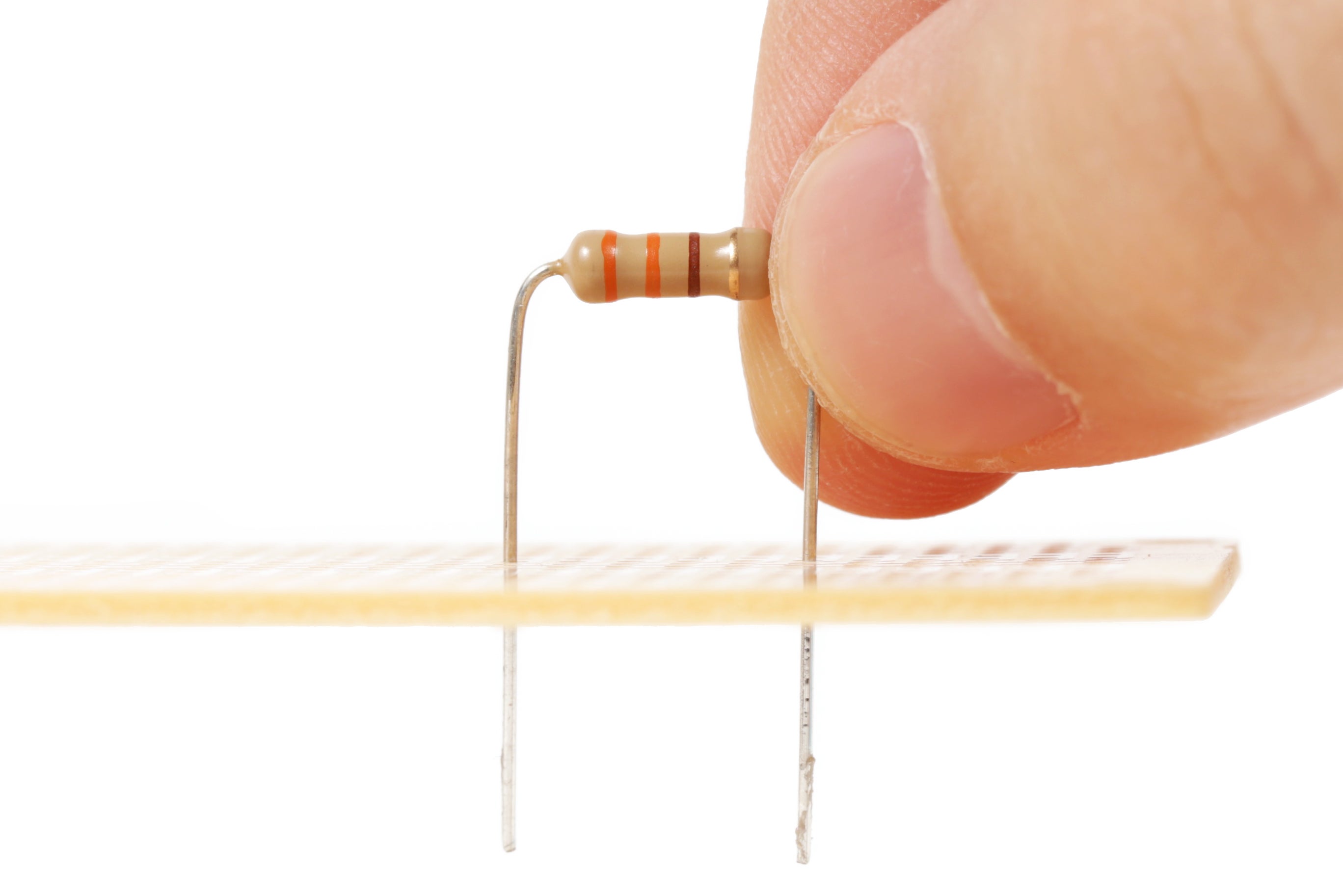 To begin, bend the resistor leads to a 90 degree angle and pass them through the PCB from the top silk-screened side to the side with the metallic pads.