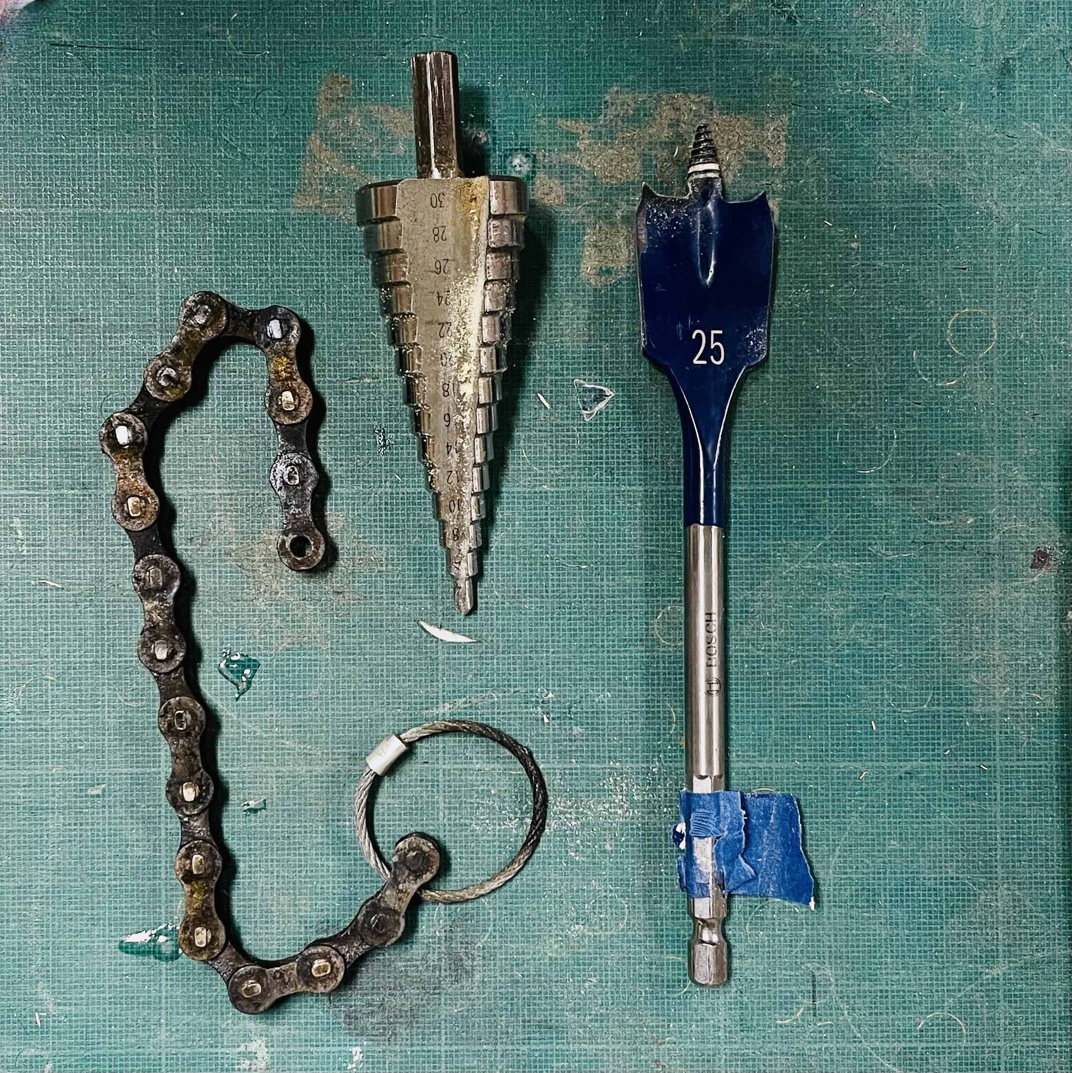 I made use of leftover bike chains, these are super nice to use for many purposes, but here they were perfect as a stable placemat when boiling water.