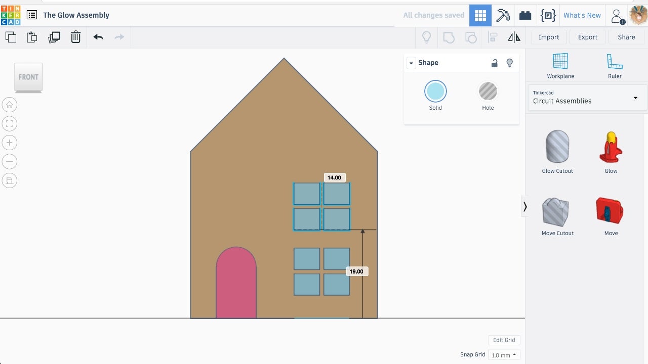 This will ensure that the Glow Cutout is centered within the walls of the house shape, while keeping it's bottom side on the workplane.
