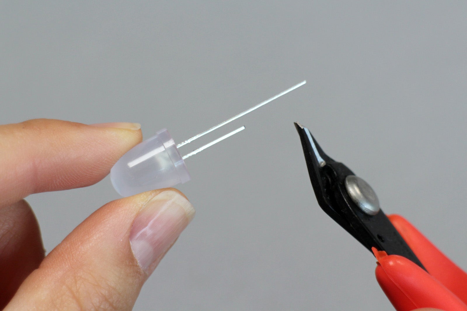 The length of the pins as they come are too long to fit into the Glow assembly. Use the wire cutters to snip off the shorter NEGATIVE (-) pin so that it's about 1/2 - 5/8" long.