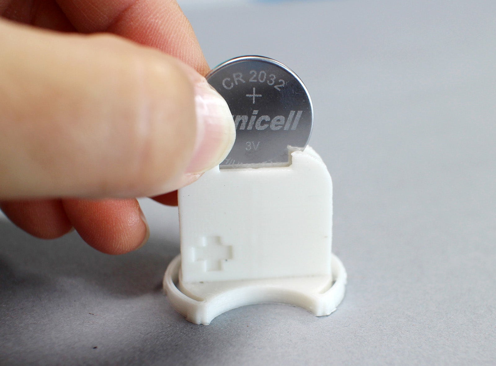 Next, add the battery to the vertical slot of the Glow holder. – with the '+' side facing the same way as the '+' sign on the printed part (as pictured above).