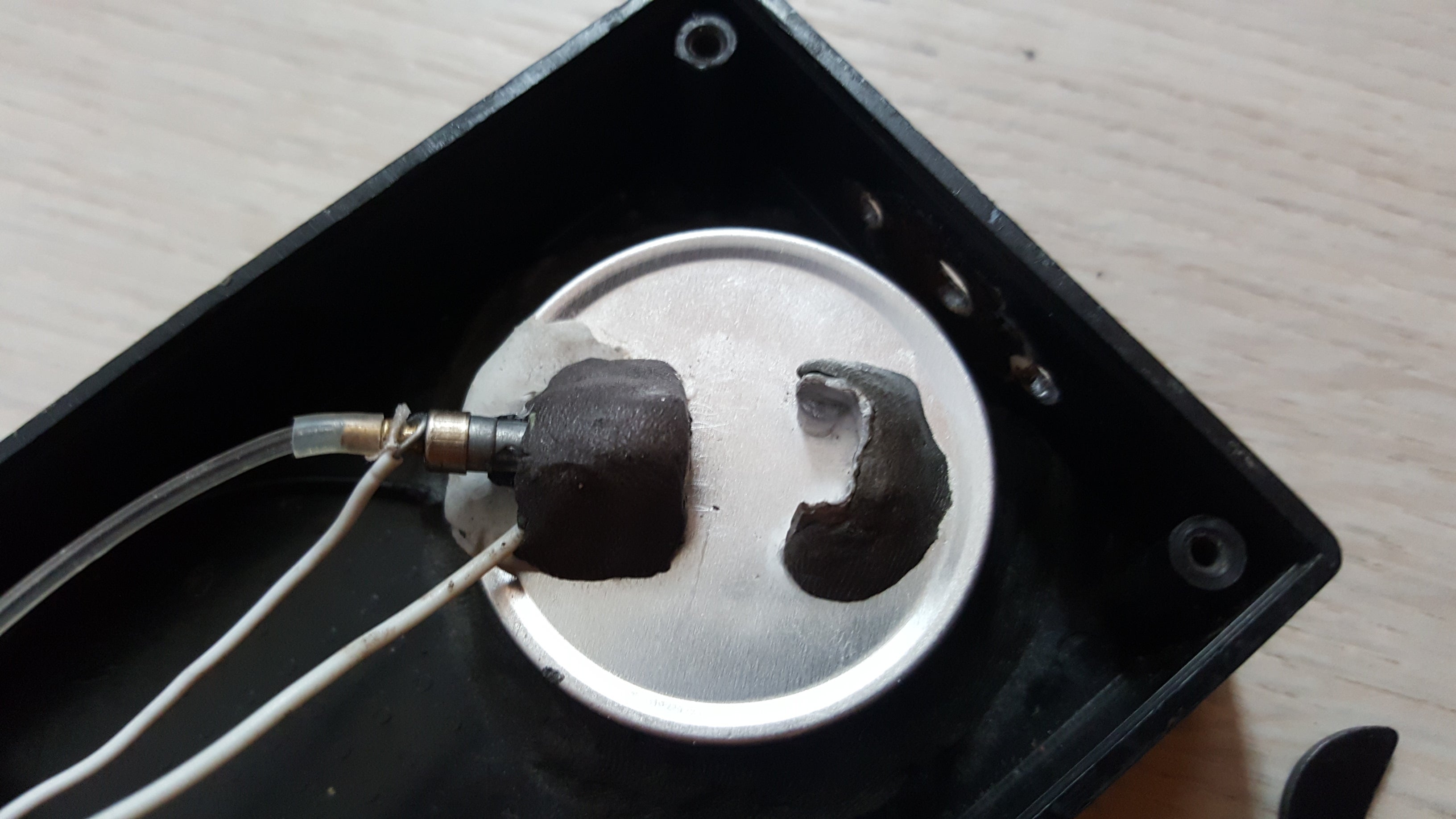 Take your sanding bit to finish off the burrs in the large hole you made, making sure your Aluminum cream jar fits in the hole. With that, take your Moldable steel epoxy and simply fix the aluminum cream jar in place!