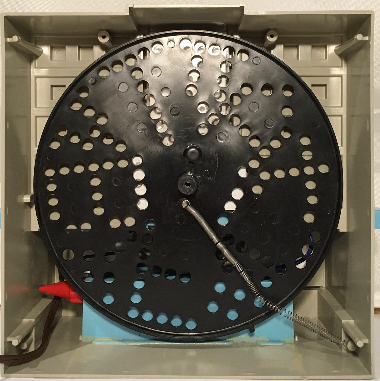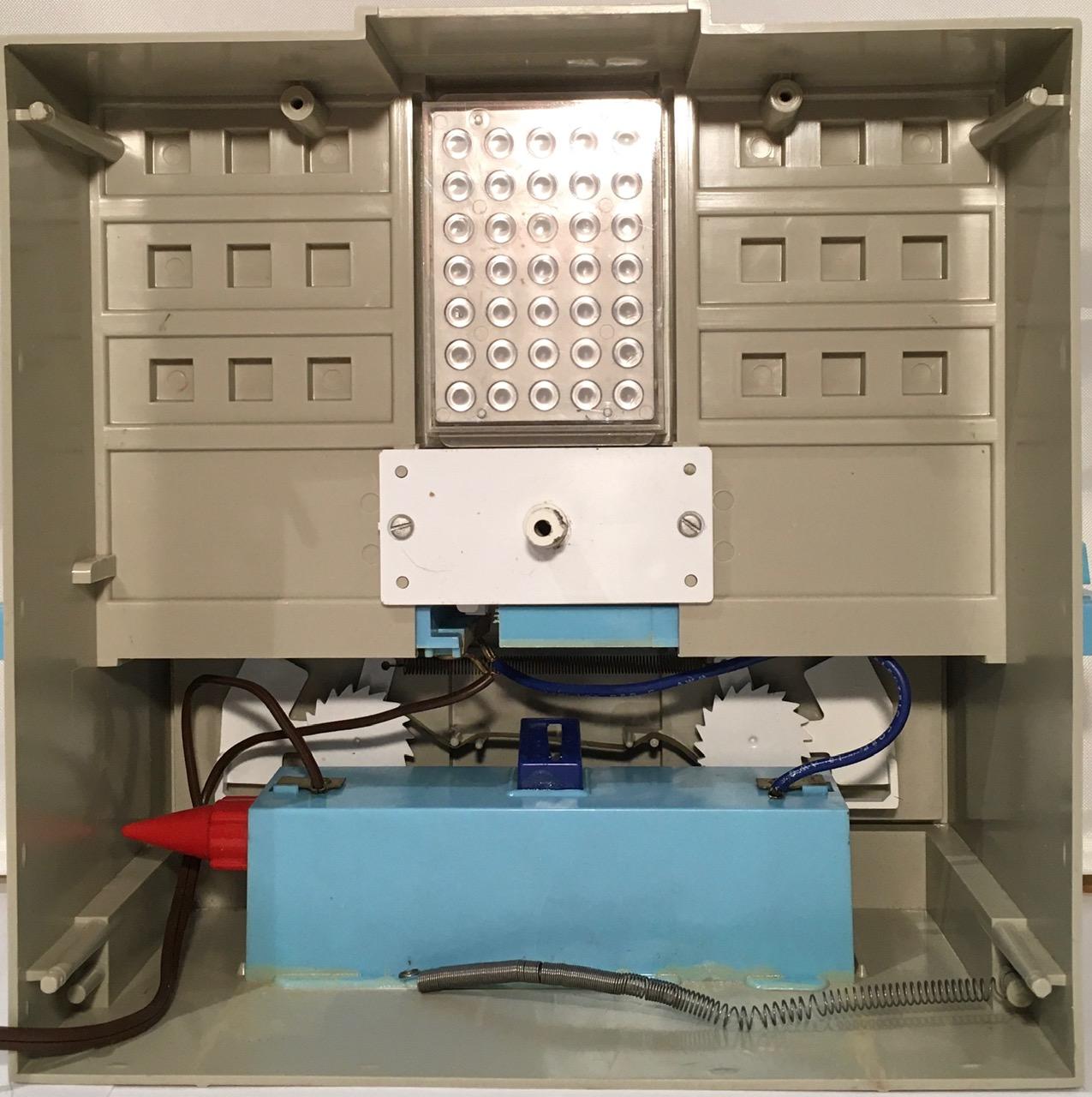 What I had assumed would be some sort of early "electronic" 5x7 matrix display, was actually just a spinning disk. In hindsight this makes sense. In 1960, LEDs are still a couple of years away. Add many more years on top of that until they would be cheap enough to be used in a product like this. Using 35 incandescent bulbs would have been a nightmare. But a spinning disk, a single incandescent bulb, and some clever diffusers, that was ingenious. IMHO, the blinking light effect achieved as Think-a-Tron is "calculating" the answer, which we had come to associate with large mainframe computers in the 60's, was outstanding.