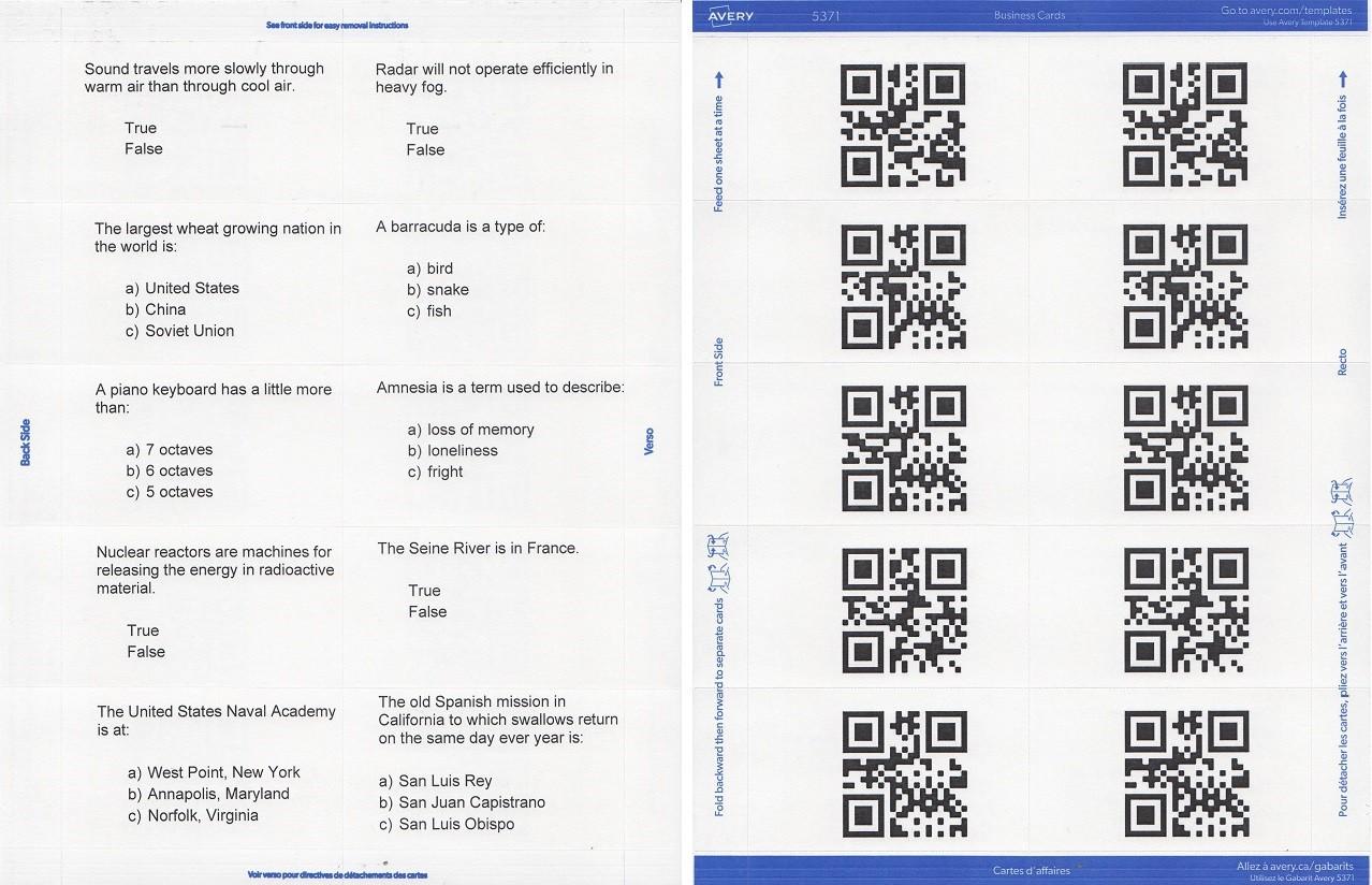 Remember, since the QR codes will be printed on the back of the question cards, that the QR code for the left question must be on the right side of the answer sheet and vice-versa. Seen here are the front of the printed sheet on the left and back on the right.