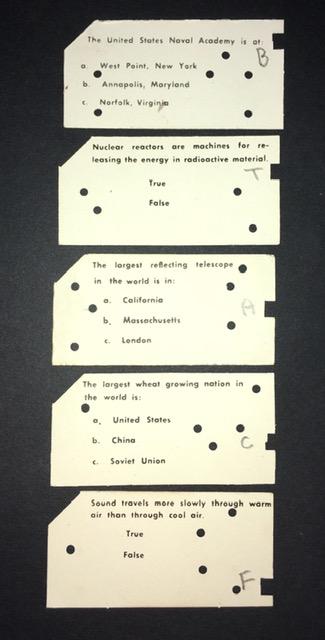 Now here is where the magic happens. As was mentioned in the video, the question cards have notches corresponding to the correct answers. The circular holes and cut corner are just for show.