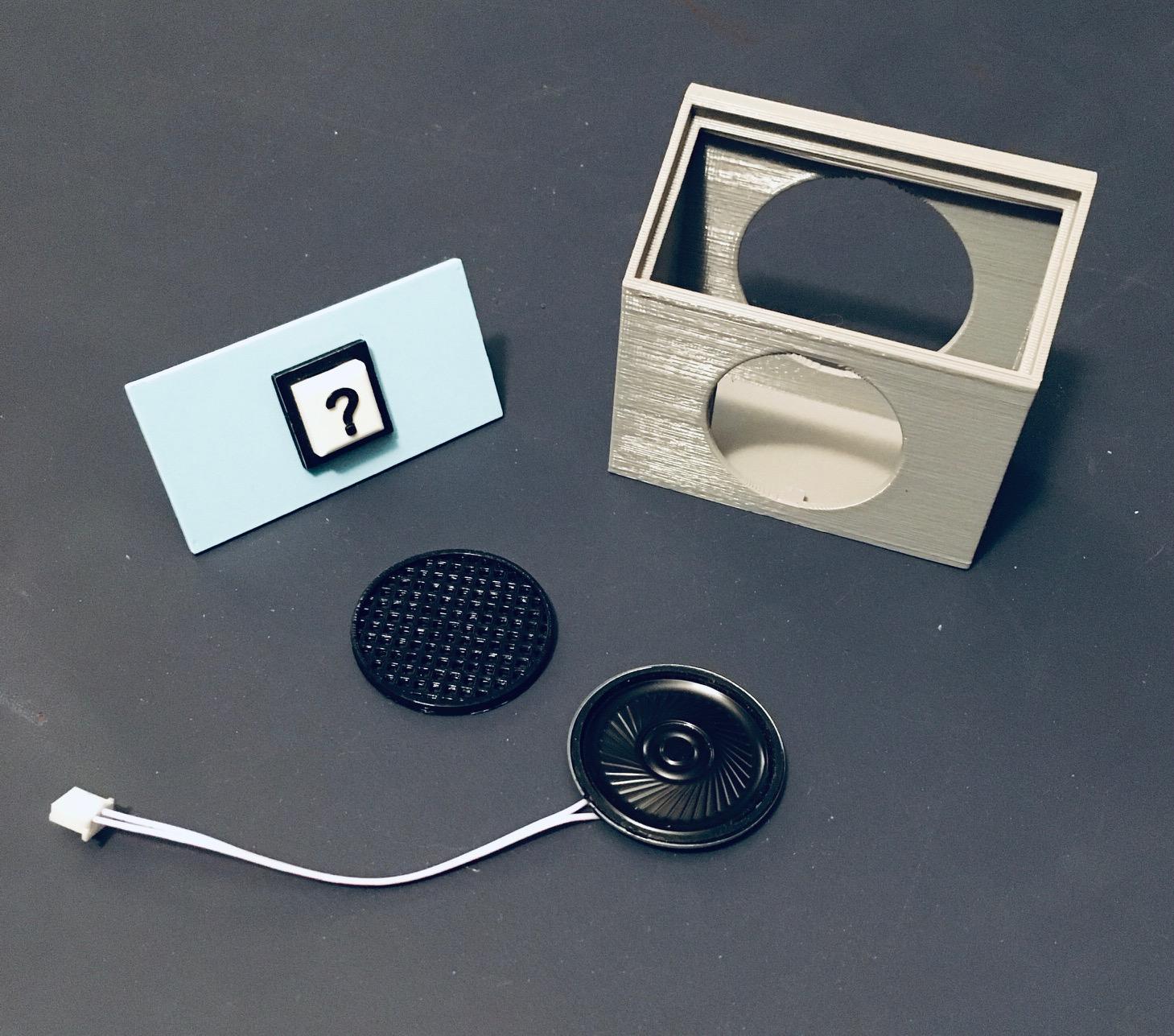 I attached the printed speaker grill to the console front with a few dabs of glue. There are slots to mount the speaker, which I secured in place with some electrical tape. I attached leads to the push button common and NO pins of the non-illuminated ? button.