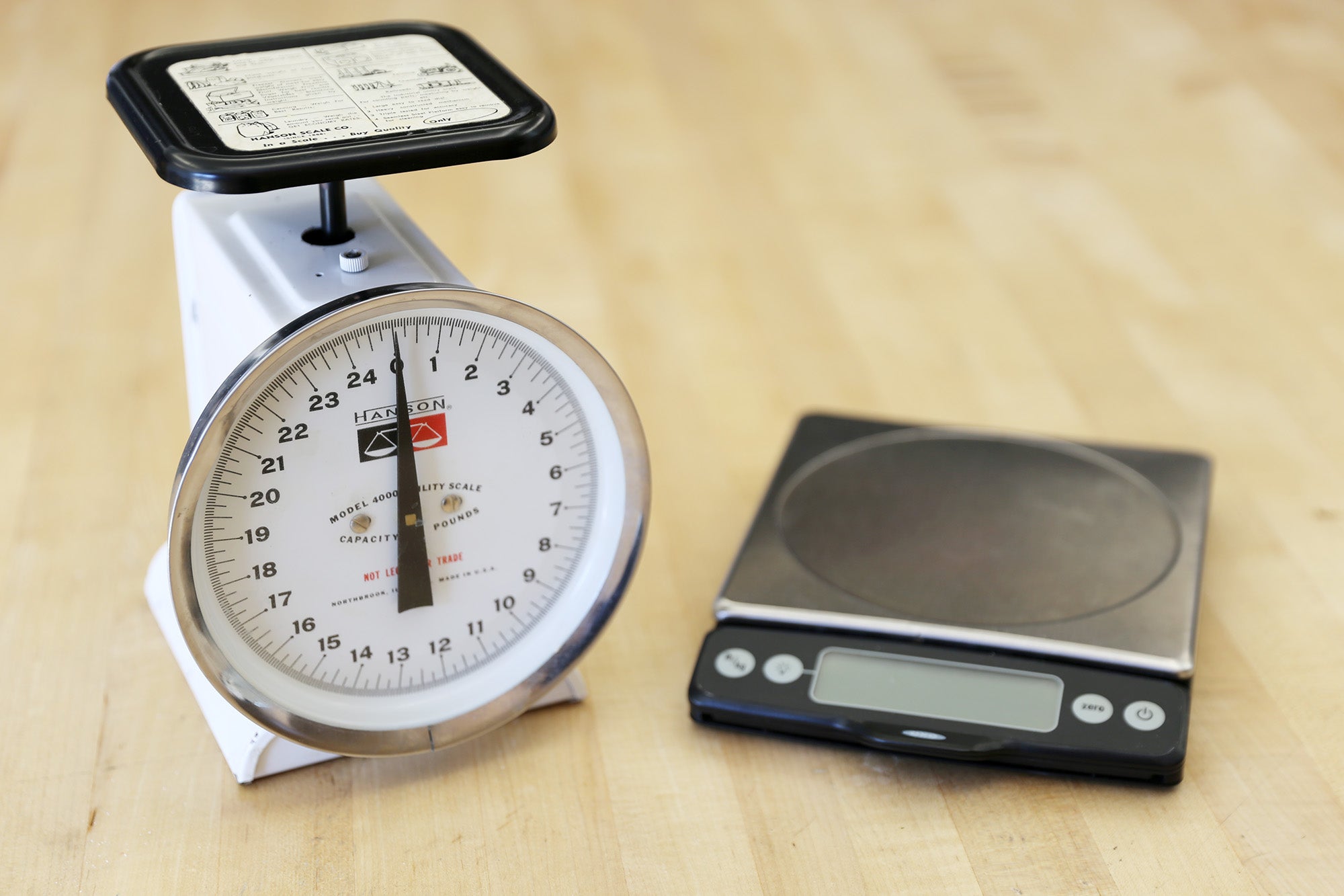 The most accurate way to prepare the correct amount of ingredients for the desired number of jars, is to use either a manual or digital kitchen scale. Both work well. The only disadvantage to having a digital scale is that if you zero out your scale for a bowl you'll be loading up, then cut up your ingredients and start loading up the bowl, the digital scale can just turn off, erasing all memory of the bowl's tare weight. This means you have to weigh the bowl and write down its tare weight so you can subtract it form the total weight. Not a big deal, but math. With the manual scale, once you zero out the weight of the bowl, it's there until you manually adjust it for the next thing.