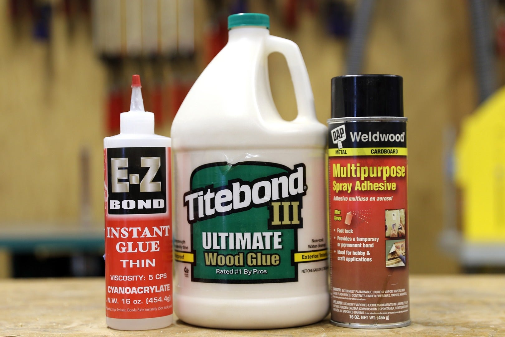 Along with clamps, holding wood down while you're working can be a challenge. For the times when a clamp is too large, or just gets in the way, double sided tape and a hot glue gun are great alternatives. Double sided tape goes for about $10 a roll, and any type of hot glue will work so shop thrifty. Of course, we're also going to need lots and lots of wood glue. There's even an entire lesson in this class dedicated to glue.