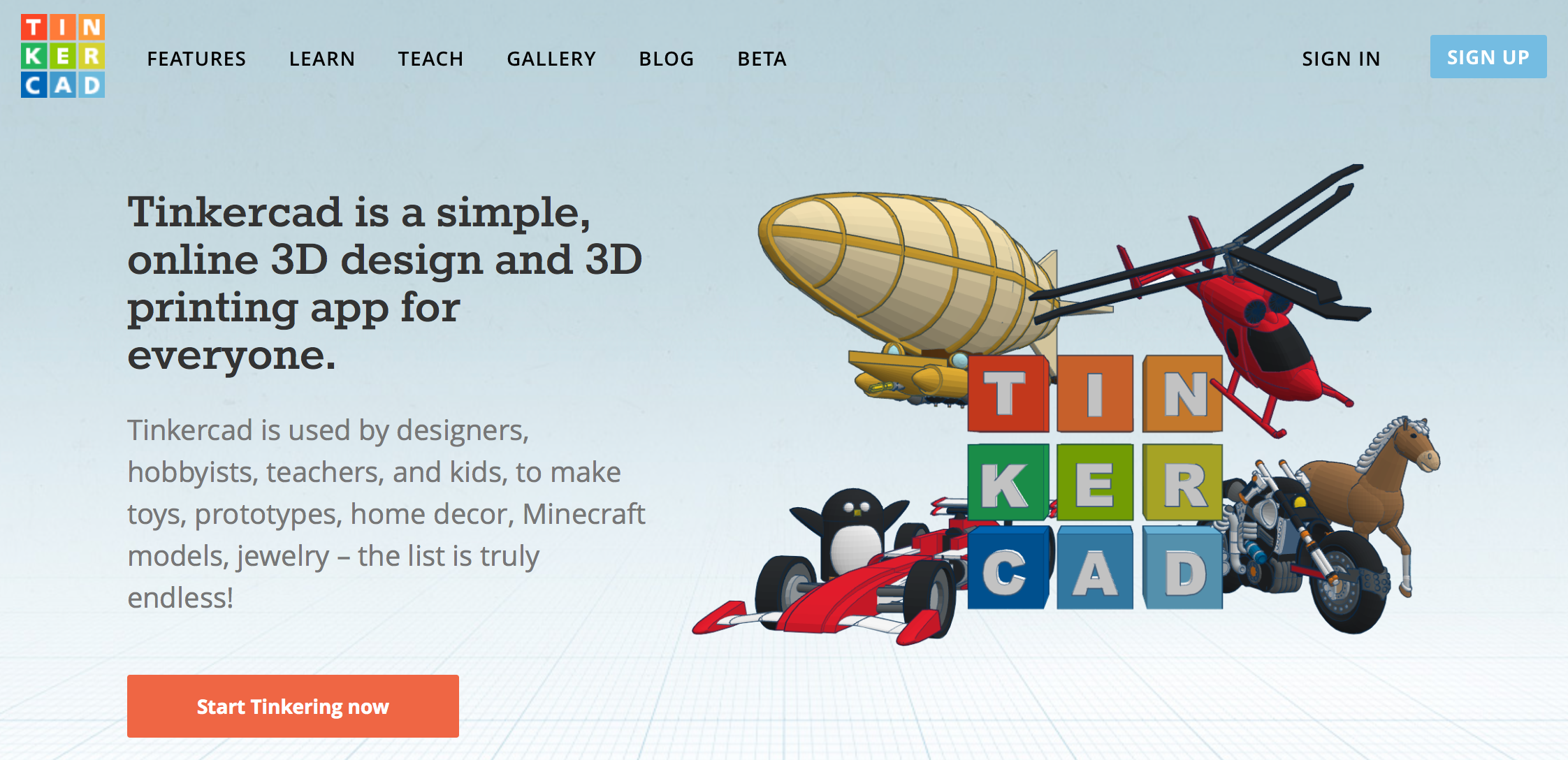In this class, we'll be using Tinkercad for all the 3D design work. It's free and browser based, so you can use it on any computer or tablet. It's an easy, fun, intuitive 3D modeling program that's great for designing objects for 3D printing.