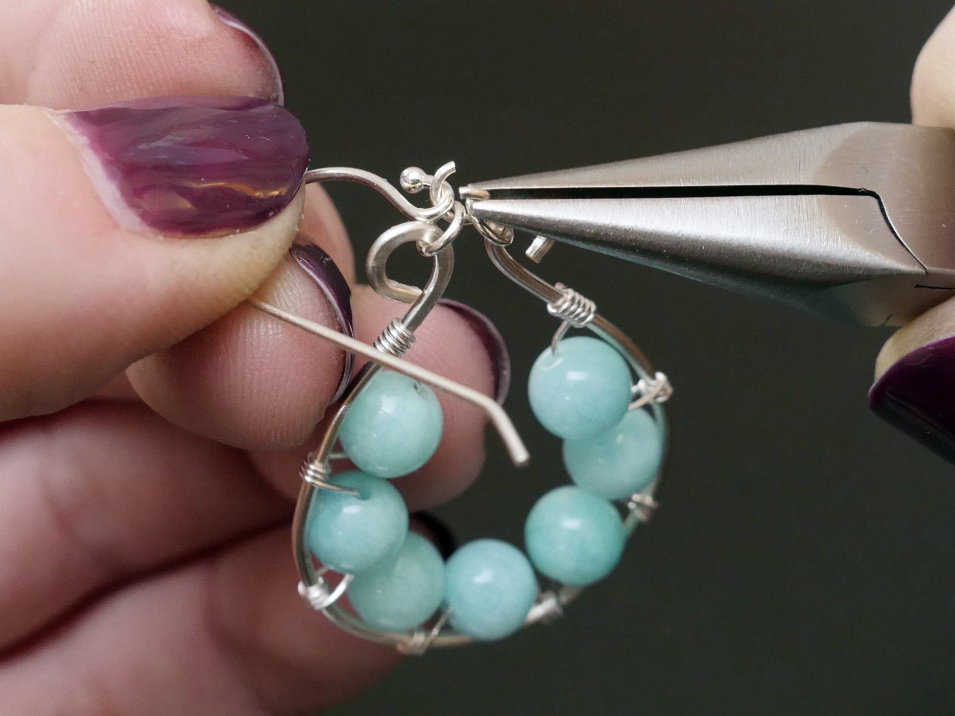 Trading soft, flexible leather for firm, yet still flexible, wire, the second project guides you through creating a pair of wire wrap and beaded earrings. Don't forget your safety glasses! You can use the same Amazonite beads as the bracelet project, or switch it up with something different. You'll build skills in shaping wire and jump rings with pliers, and optionally add some surface texture with a hammer and bench block.