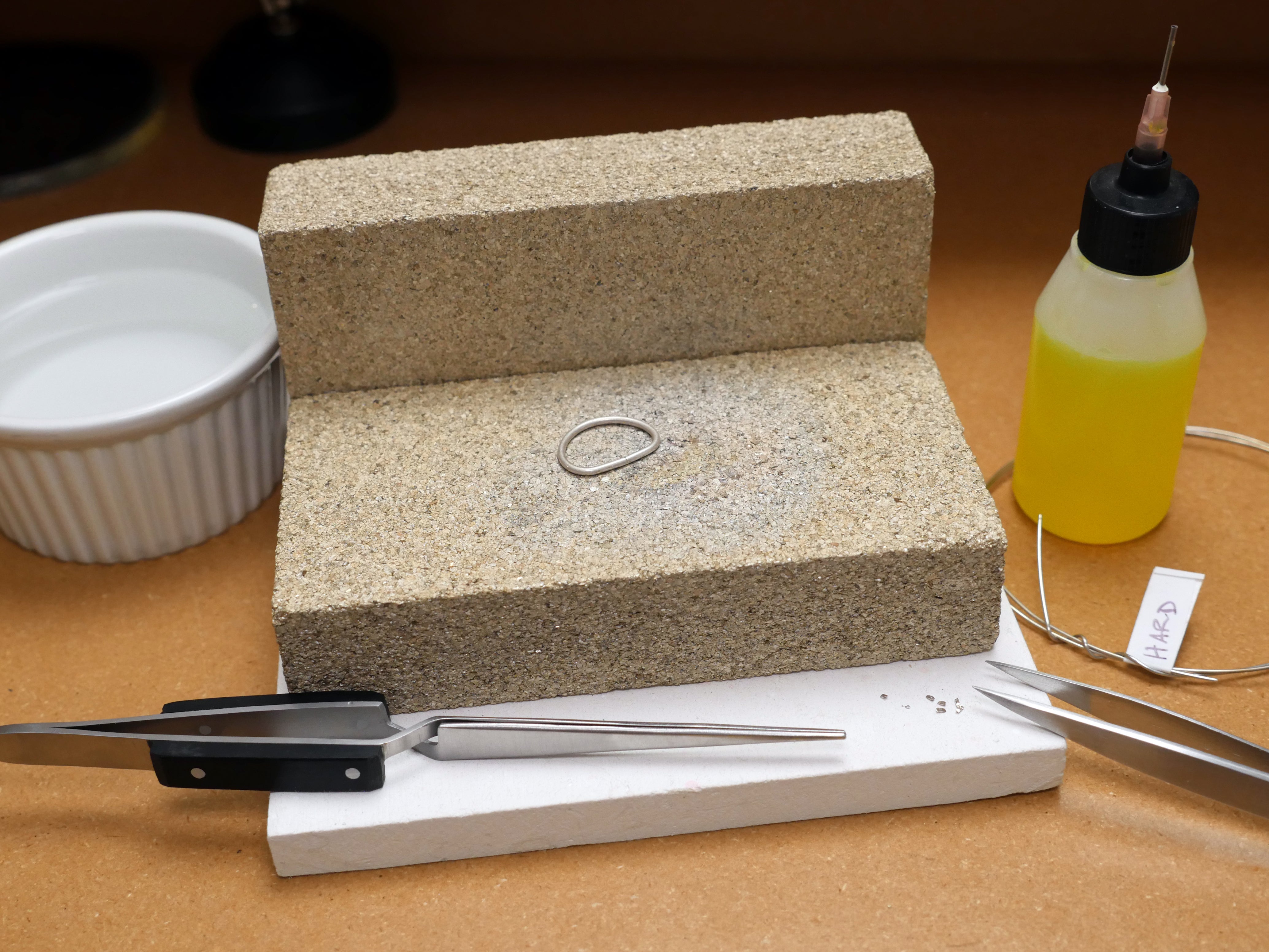 Grab your tweezers, cross-locking tweezers, solder pick, and a quench container with water. Put your to-be-soldered ring on your fireproof work surface. The yellow bottle is flux, which we'll explore in the next step.