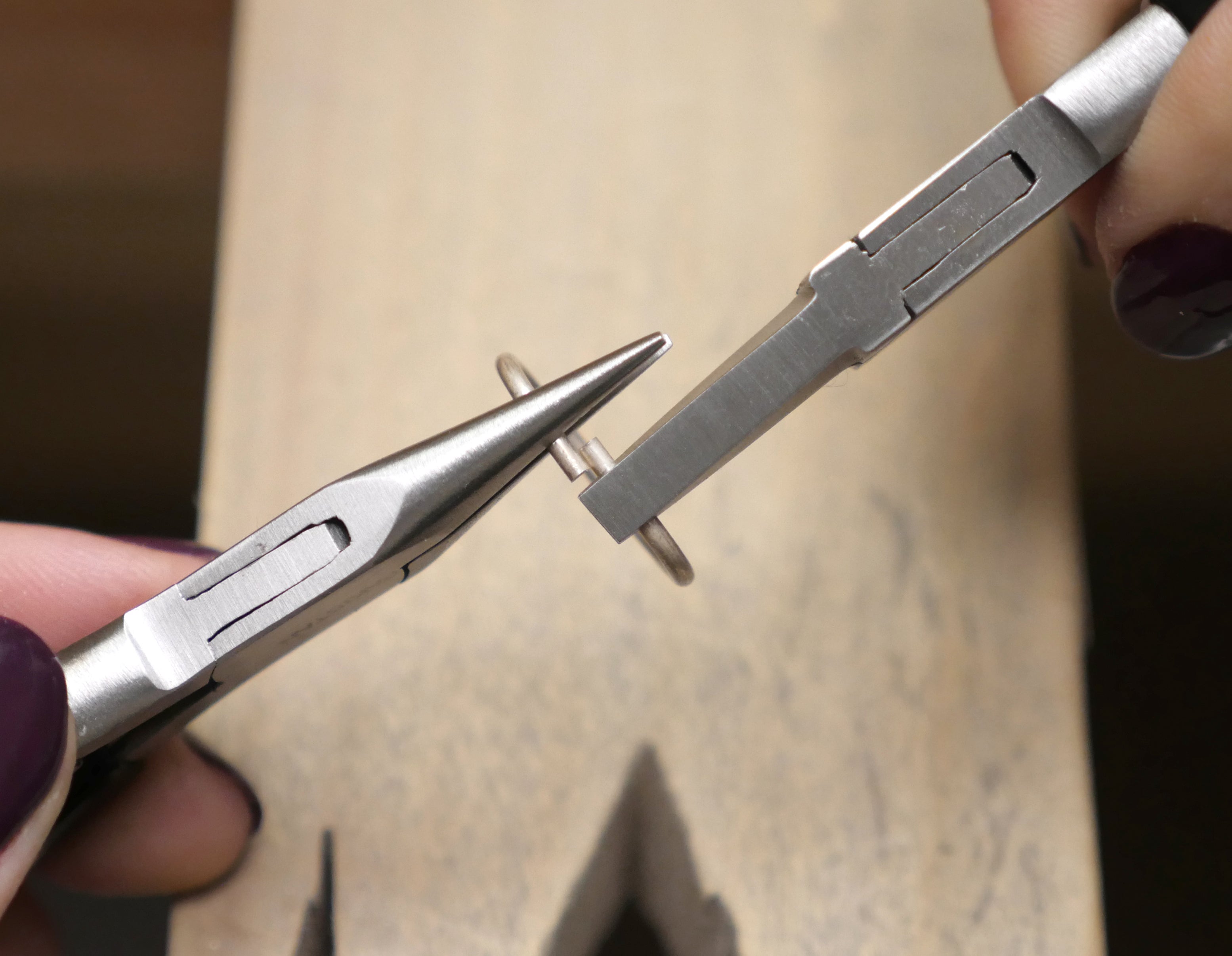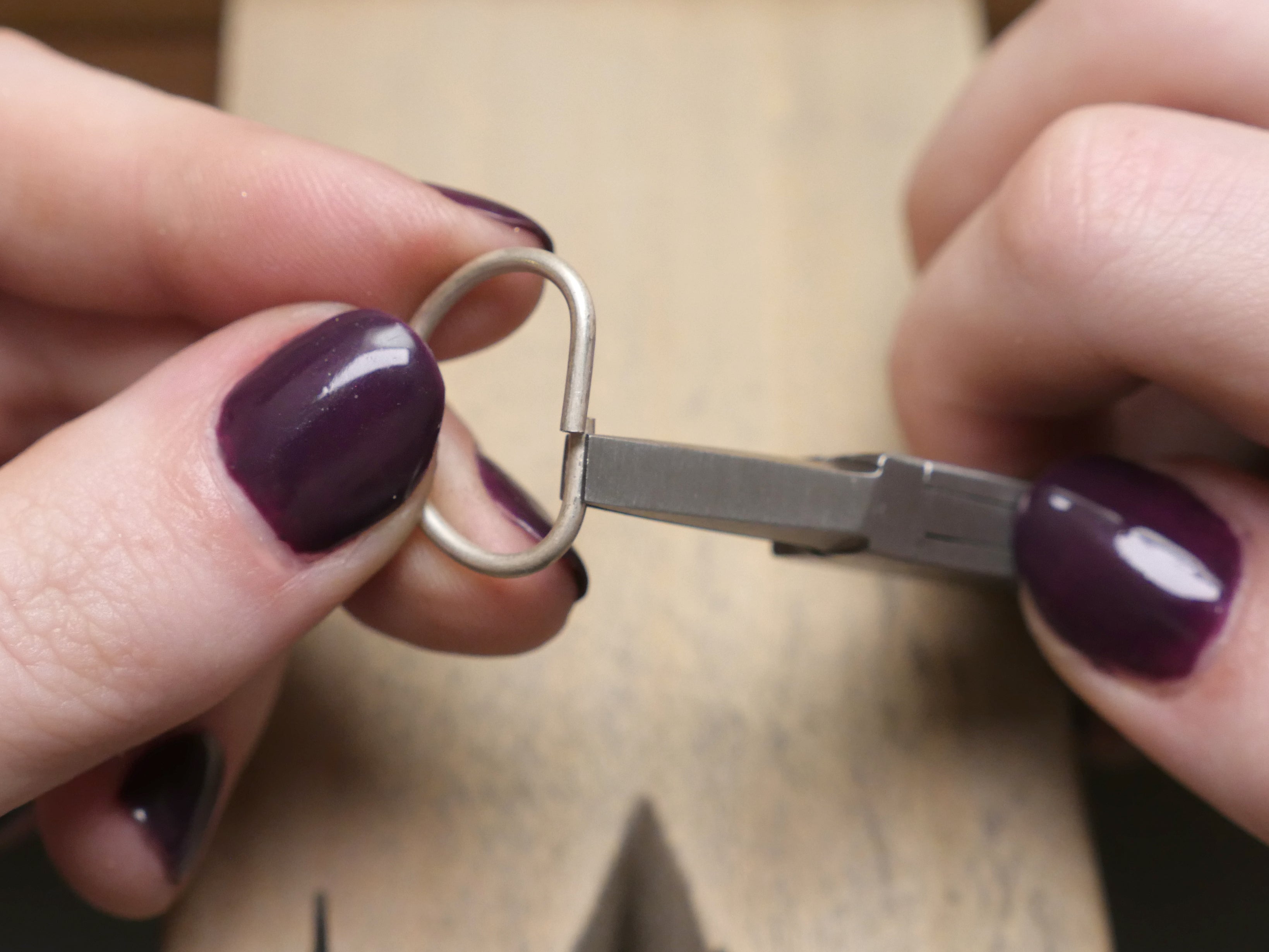 Next, use your fingers to pull the ends apart just enough to snap the filed ends to butt up against one another, and adjust the wire ends to stay that way, as if closing a large jump ring. The tension of the overlap puts pressure on joint, clamping it securely together in preparation to be soldered.