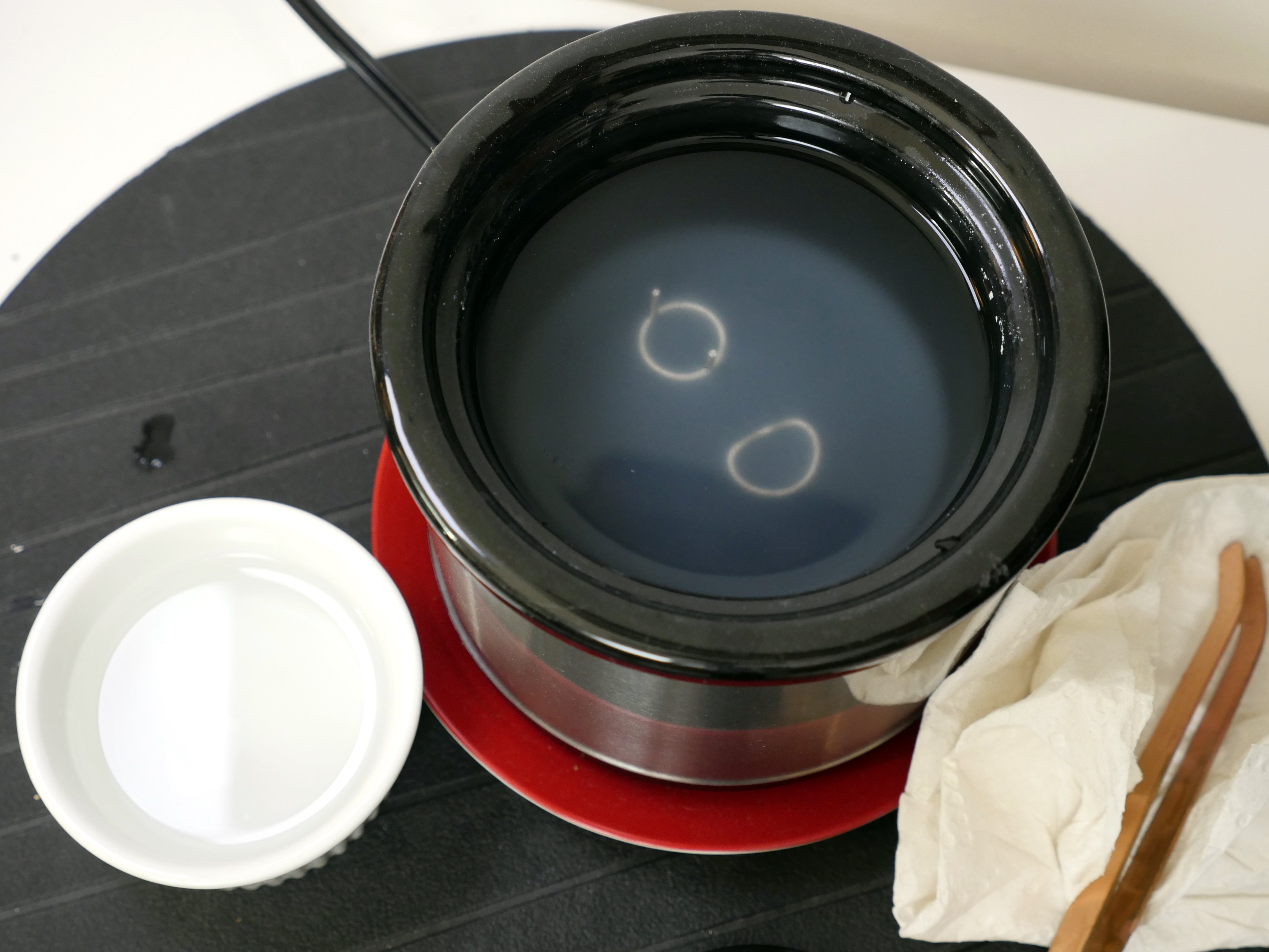 Allow your ring to cool for several seconds, then transfer it to your water-filled quench container using cross-locking tweezers, just to ensure it's cool enough to touch, then plop it into the heated pickle pot to soak. Never place hot metal pieces directly from the soldering surface into the pickle, as the reaction could release harmful fumes.